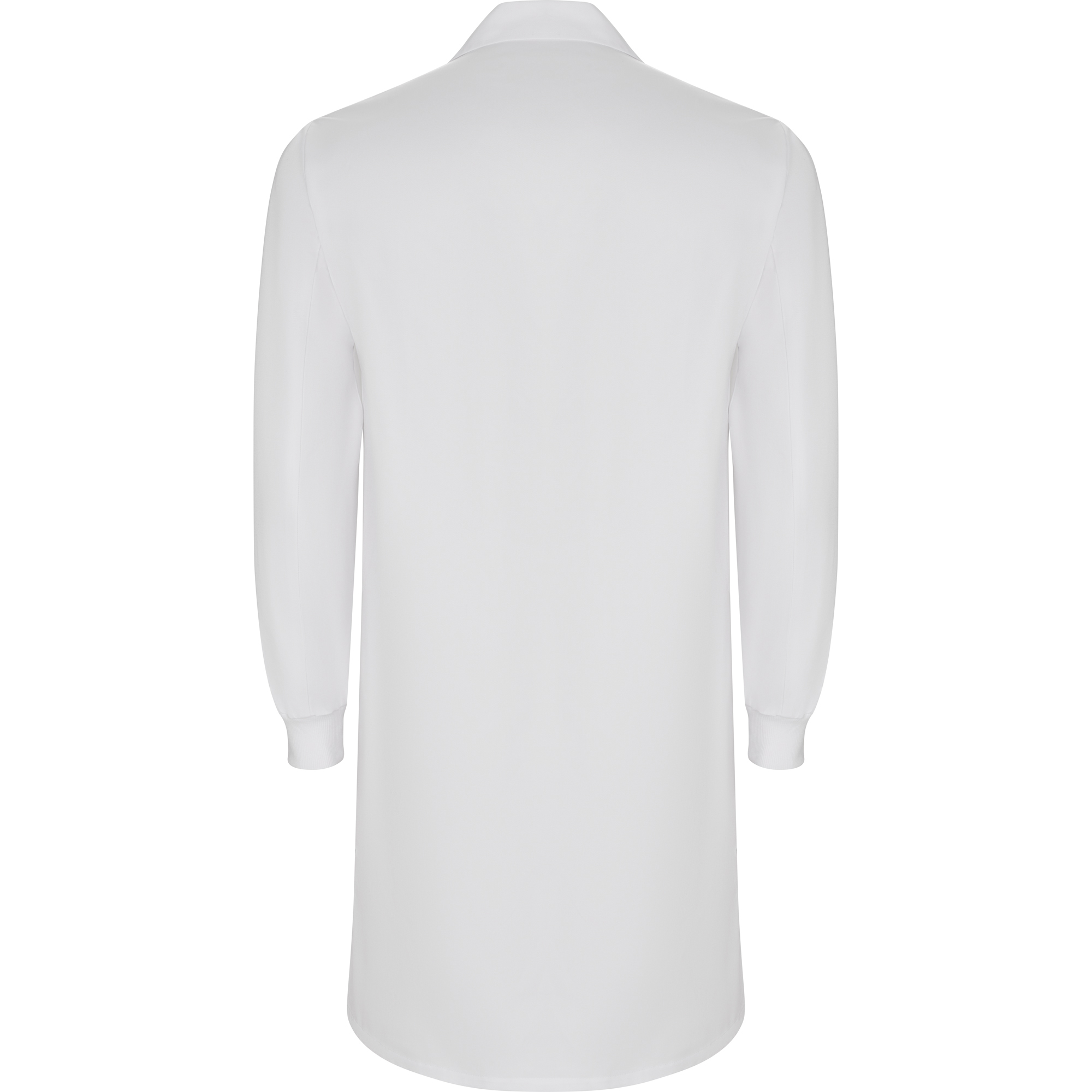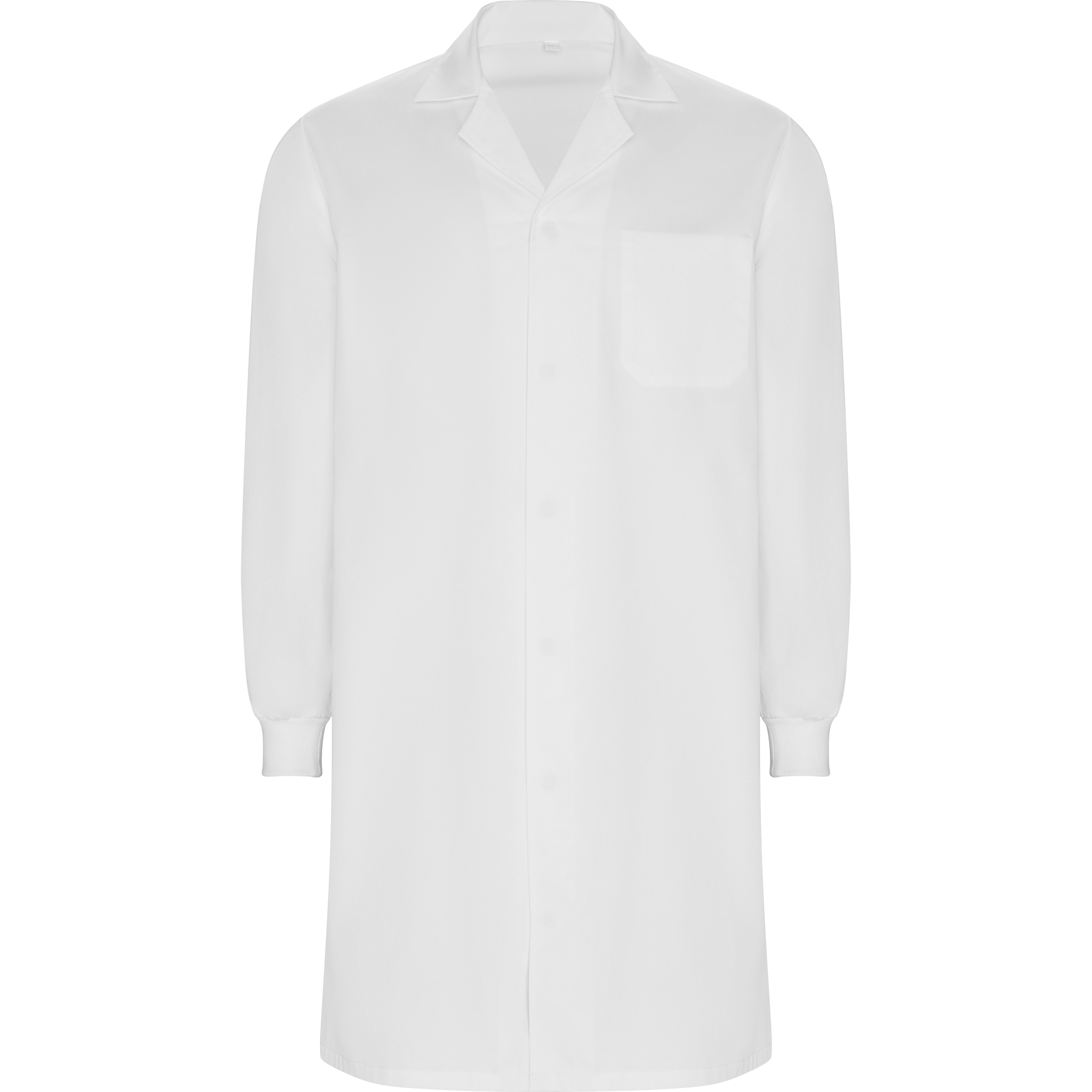 Bata de manga larga unisex. Abertura central con botones automáticos en el interior. Bolsillo interior en pecho izquierdo. Puños ajustables de canalé 1×1.