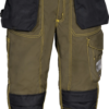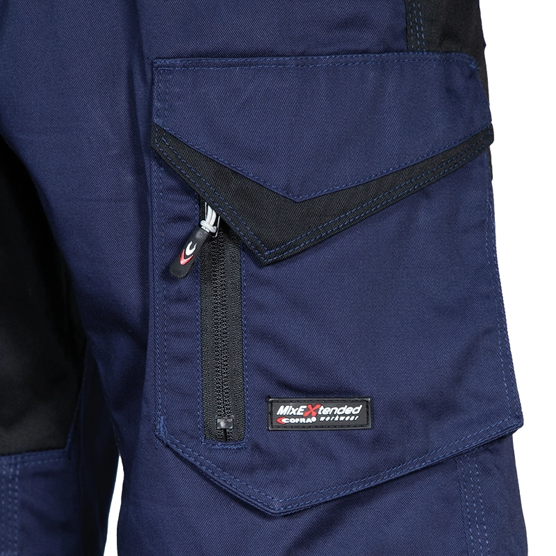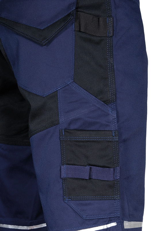 Amplios bolsillos delanteros, entrepierna y parte trasera en tejido elástico para máxima libertad de movimiento, doble bolsillo posterior, uno de los cuales con tapeta, con cierre de velcro, elástico interior en la cintura, insertos reflectantes, pasador portamartillo, bolsillo lateral con doble abertura (cierre con velcro y cremallera), bolsillo porta metro. Composición: 60% algodón – 40% poliéster / Tejido elástico: 60% algodón – 37% poliéster – 3% elastán. Gramaje: 245 g/m².