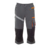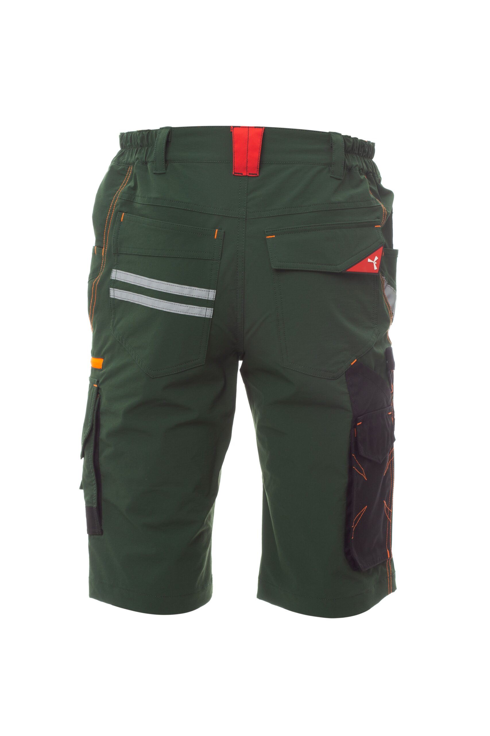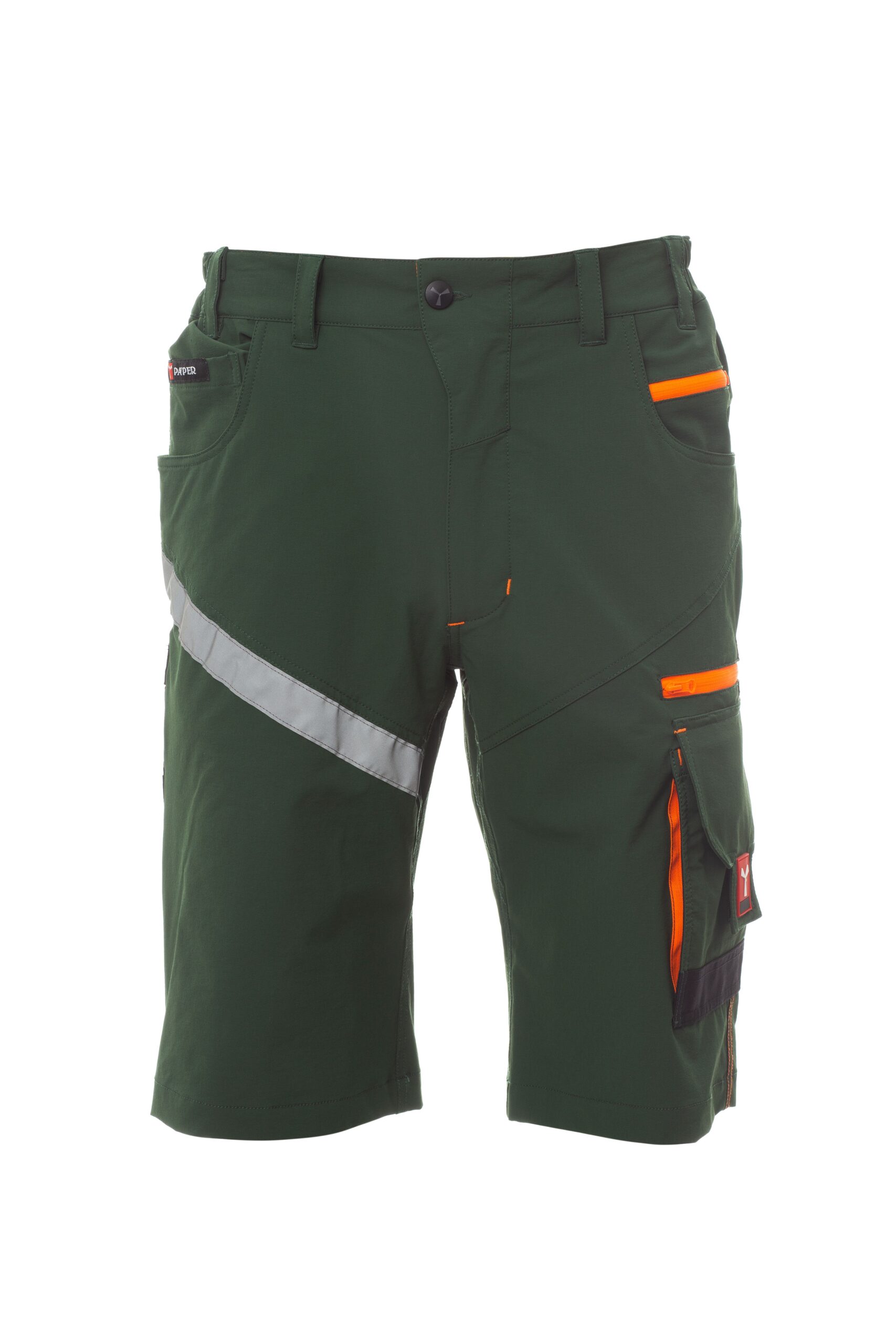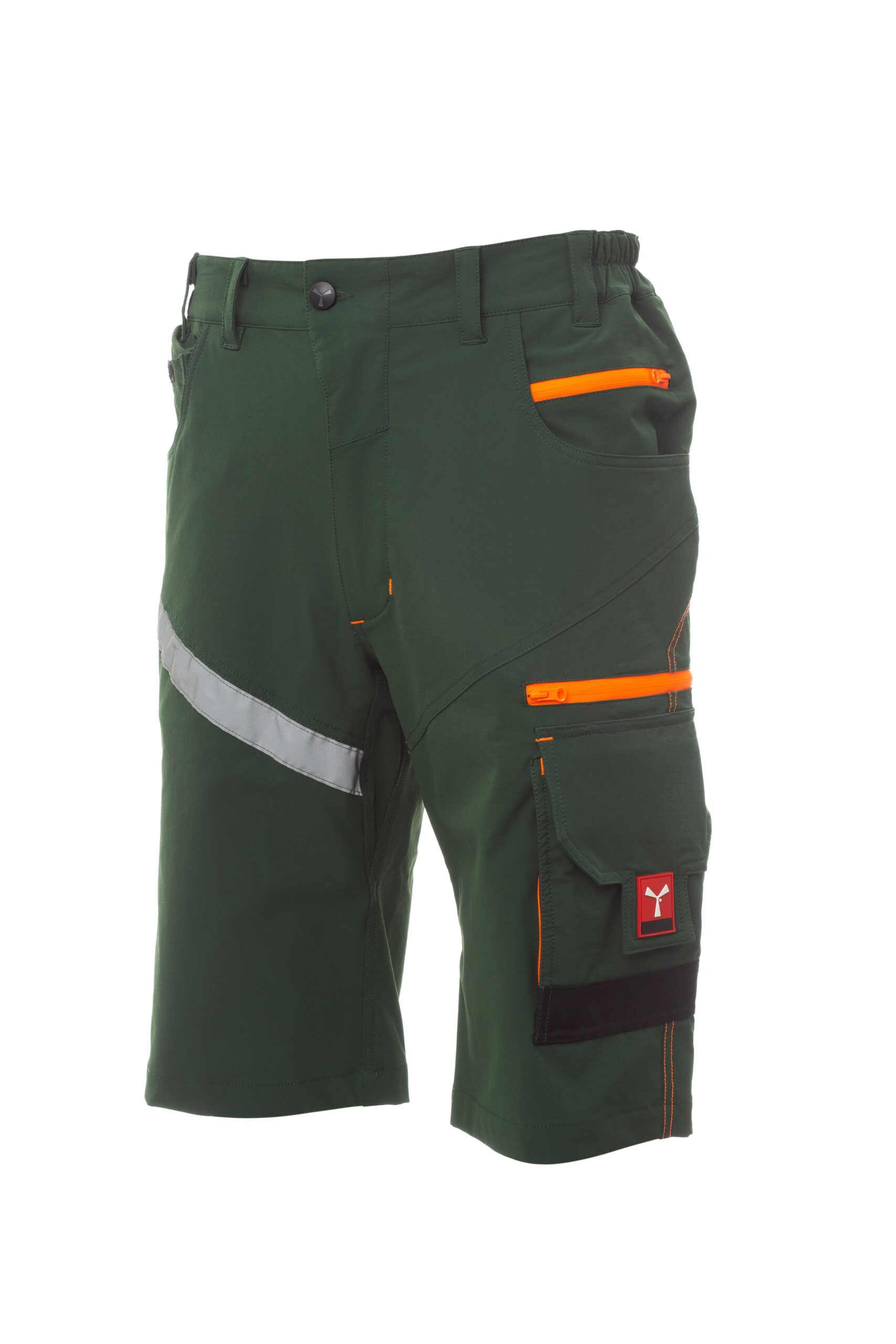 Bermudas unisex, tejido «4 way stretch», con elásticos laterales y trabillas en la cintura, cierre con cremallera y botón personalizado. En el delantero tiene dos bolsillos redondeados, un bolsillo pequeño para monedas a la derecha y un bolsillo pequeño de seguridad cerrado con cremallera a la izquierda. En la parte delantera de la pernera izquierda presenta 3 bolsillos: un bolsillo horizontal cerrado con una cremallera, un bolsillo con tapeta perfilada cerrado con velcro y con soporte para tarjeta de identificación y un bolsillo pequeño vertical cerrado con cremallera. Banda retrorreflectante en la parte delantera de la pernera derecha. En la parte trasera presenta un bolsillo con tapeta cerrado con velcro y un bolsillo sin tapeta pero con 2 bandas retrorreflectantes, una anilla para el martillo (pernera derecha), un bolsillo abierto para el metro (pernera derecha) y un bolsillo para el teléfono móvil con tapeta y velcro (pernera derecha). También presenta pespuntes laterales y costuras de refuerzo en contraste en distintos puntos. En las tallas (italianas) centrales 48-50-52, el interior de la pernera tiene una longitud de 31 cm. Composición: 90% Nailon + 10% Elastano. Gramaje: 170 GR/MQ