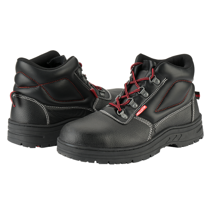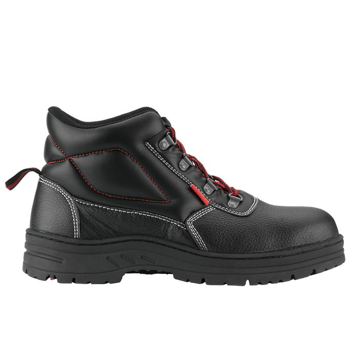 Bota de seguridad Classic S3 con plantilla antiperforación, puntera de protección metálicas y suela de nitrilo 100% cosida para las condiciones más extremas de calor y humedad. Corte compuesto de piel hidrófuga negra con detalles rojos. Cómoda, robusta y para todas las climatologías..