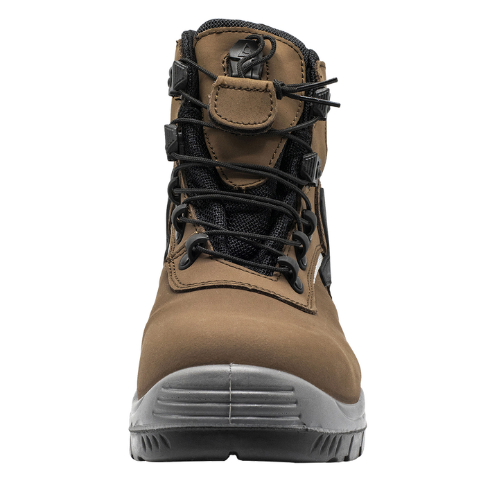 Bota de seguridad Click S3, con plantilla antiperforación textil y puntera de composite, en piel nobuk hidrofugada marrón resistente a la penetración y absorción del agua y detalles a contraste. Cierre rápido Click que se aprieta y suelta fácilmente. De horma ancha, cómoda, ligera y flexible, adecuada para uso en almacenes, industria y exterior.