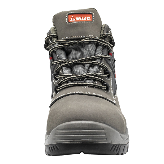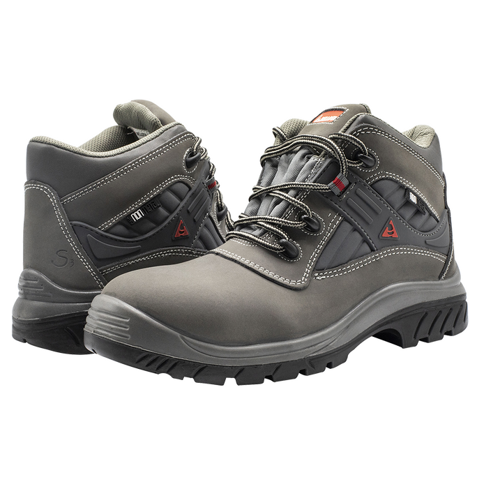 Bota de seguridad Nonmetal Light S3, con plantilla antiperforación textil y puntera de composite, en piel nobuck hidrofugada gris resistente a la penetración y absorción del agua con detalles y logo en el latera. De horma ancha, cómoda, ligera y flexible, adecuada para usos de almacenaje, transporte, industria y construcción.