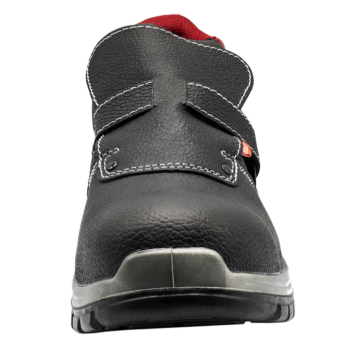Bota de seguridad Classic S3 Soldador, con plantilla antiperforación y puntera de protección metálicas. El corte está compuesto de piel hidrófuga negra con una anilla metálica de desprendimiento rápido para trabajos de soldadura en construcción e industria y detalles en rojo y gris.