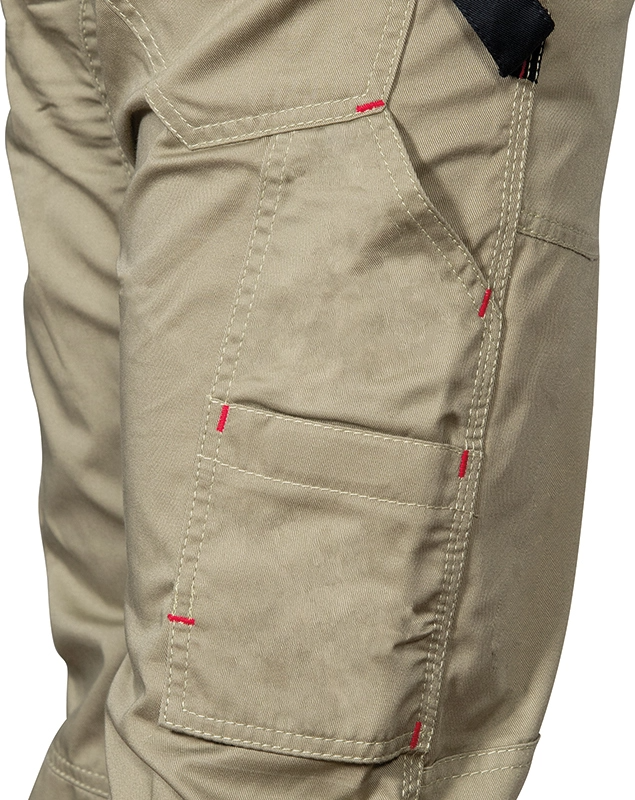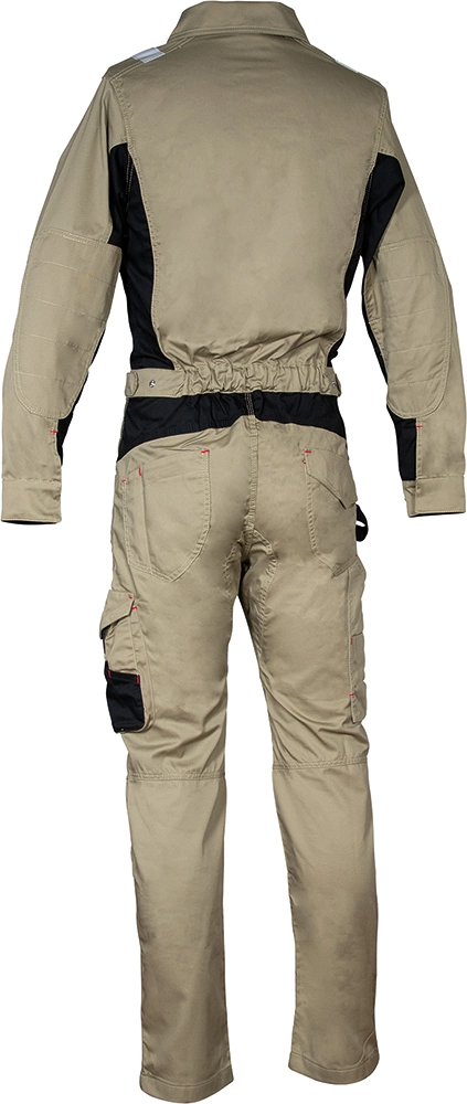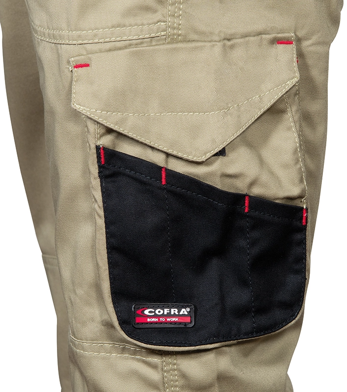 Amplios bolsillos delanteros y en el pecho, doble bolsillo trasero, uno con tapeta, cintura ajustable y elástica, insertos reflectantes, inserto portabolígrafos, pasador portamartillo, puños regulables, corte ergonómico de las mangas y de las piernas, bolsillo lateral con insertos porta herramientas, bolsillo portamóvil con tejido aislante E-WARD, bolsillo porta metro, parche de refuerzo en los codos y rodillas, cremallera YKK®. Composición: 60% algodón – 40% poliéster. Gramaje: 245 g/m².