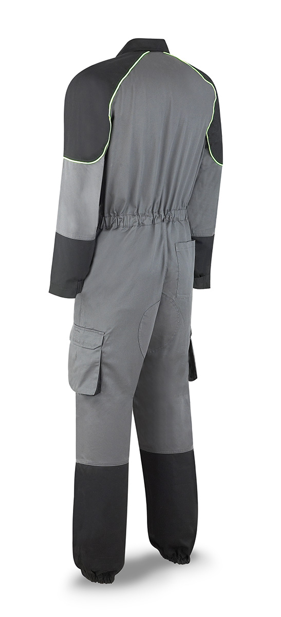Buzo con cuello sastre en color de contraste, fabricado con tejido de 245 gr/m2. Nueve bolsillos: dos en cadera tipo francés, dos en pecho de boca vertical con cierre por cremallera, uno en pecho tipo cargo para pequeños dispositivos, uno trasero de parche, de boca horizontal, dos en perneras tipo cargo de fuelle y uno en pernera de boca horizontal ubicado en la pernera izquierda. Ajuste a cadera por elástico trasero y refuerzo en culera. Composición y masa laminar: Composición: 65% poliéster 35% algodón. Masa laminar: 245 gr/m2.