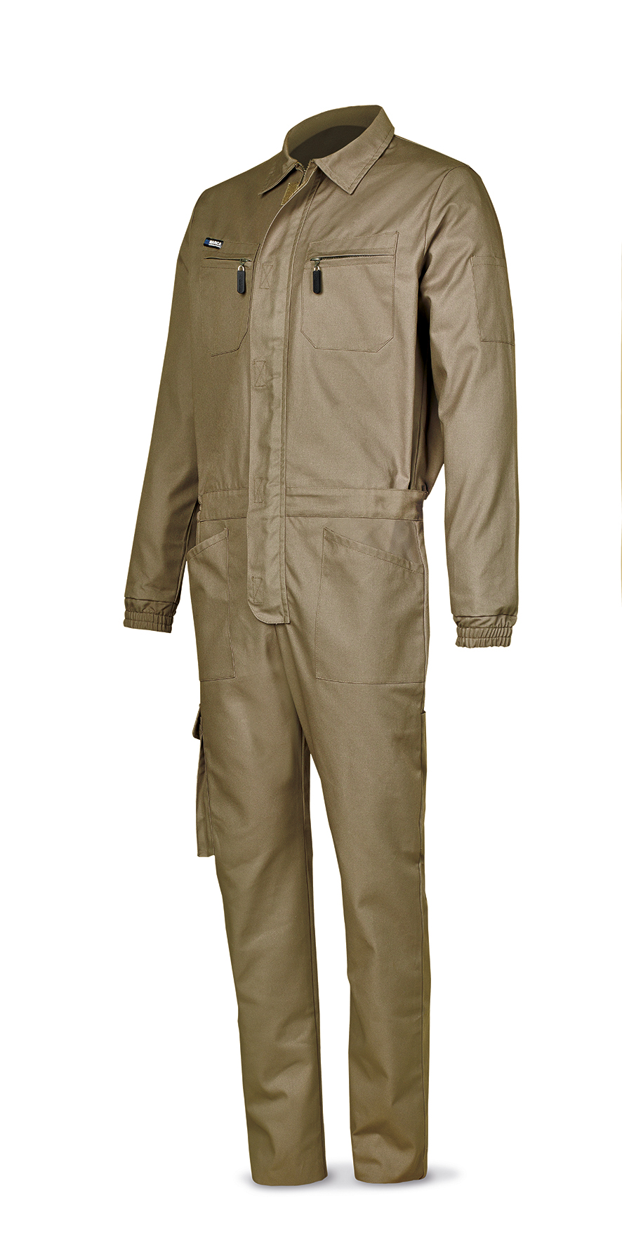 Buzo fabricado con tejido de 245 gr/m2. 7 bolsillos: 2 de parche a la cadera, 1 trasero de parche ubicado a la derecha, 1 tipo cargo con tapeta, ubicado en la pierna derecha, 2 de parche de boca horizontal ubicados en pecho y 1 portabolis con 2 estibas ubicado en el brazo izquierdo. Ajuste a cadera por elásticos laterales. Composición y masa laminar: Composición: 65% poliéster y 35% algodón. Masa laminar: 245 gr/m2.
