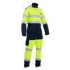 Buzo multinorma. Tejido inherente para una mayor durabilidad. Unión de la parte superior e inferior mediante una cintura elástica. Cierre de cremallera cubierto con solapa de velcro. 2 bolsillos delanteros con apertura vertical. 2 bolsillos laterales con tapa de solapa de velcro. 2 bolsillos traseros con tapa de solapa de velcro. Puños elásticos de manga con ajuste de velcro. Longitud de las piernas extensibles. Ignífugo, antiestático y protección contra arco eléctrico. Detalles en color rojo. Tejido: 65% modacrílico, 33% algodón y 2% fibra antiestática. GSM: 270GSM.