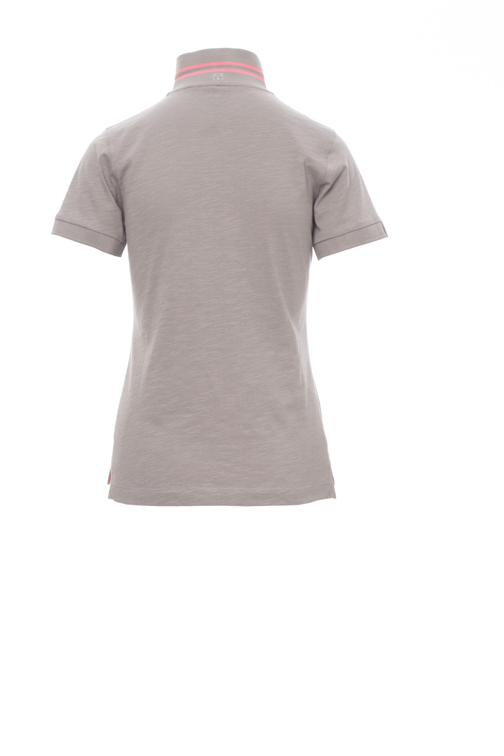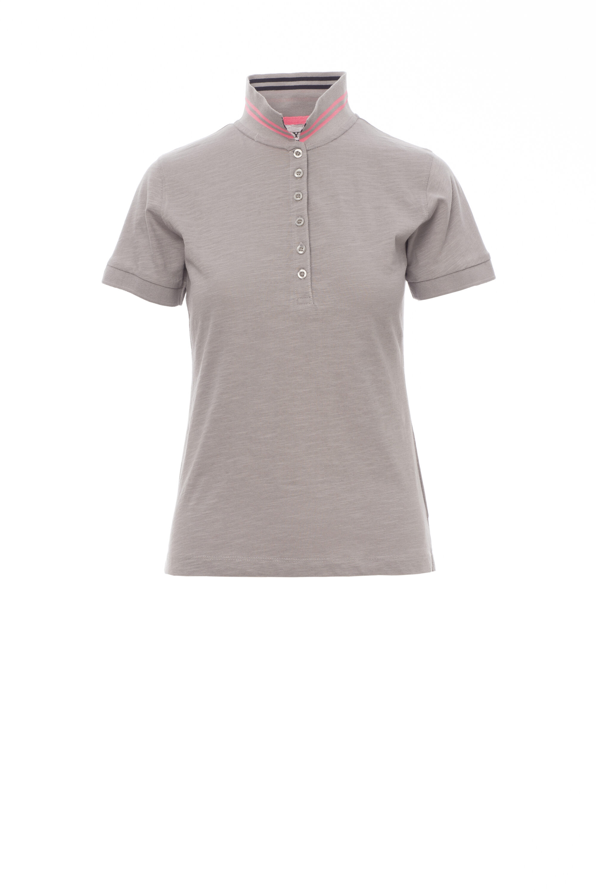 Camiseta polo ceñida de manga corta para mujer con 6 botones efecto nácar a juego, cuello con cintas rayas de contraste y rayas fluorescentes en la parte inferior, cuello y extremo de las mangas elásticos, manga recta con inserción, ventilaciones laterales y pespunte en cuello oculto con cinta fluorescente, etiqueta de transferencia. Composición: 100 % Algodón. Gramaje: 160 GR/MQ