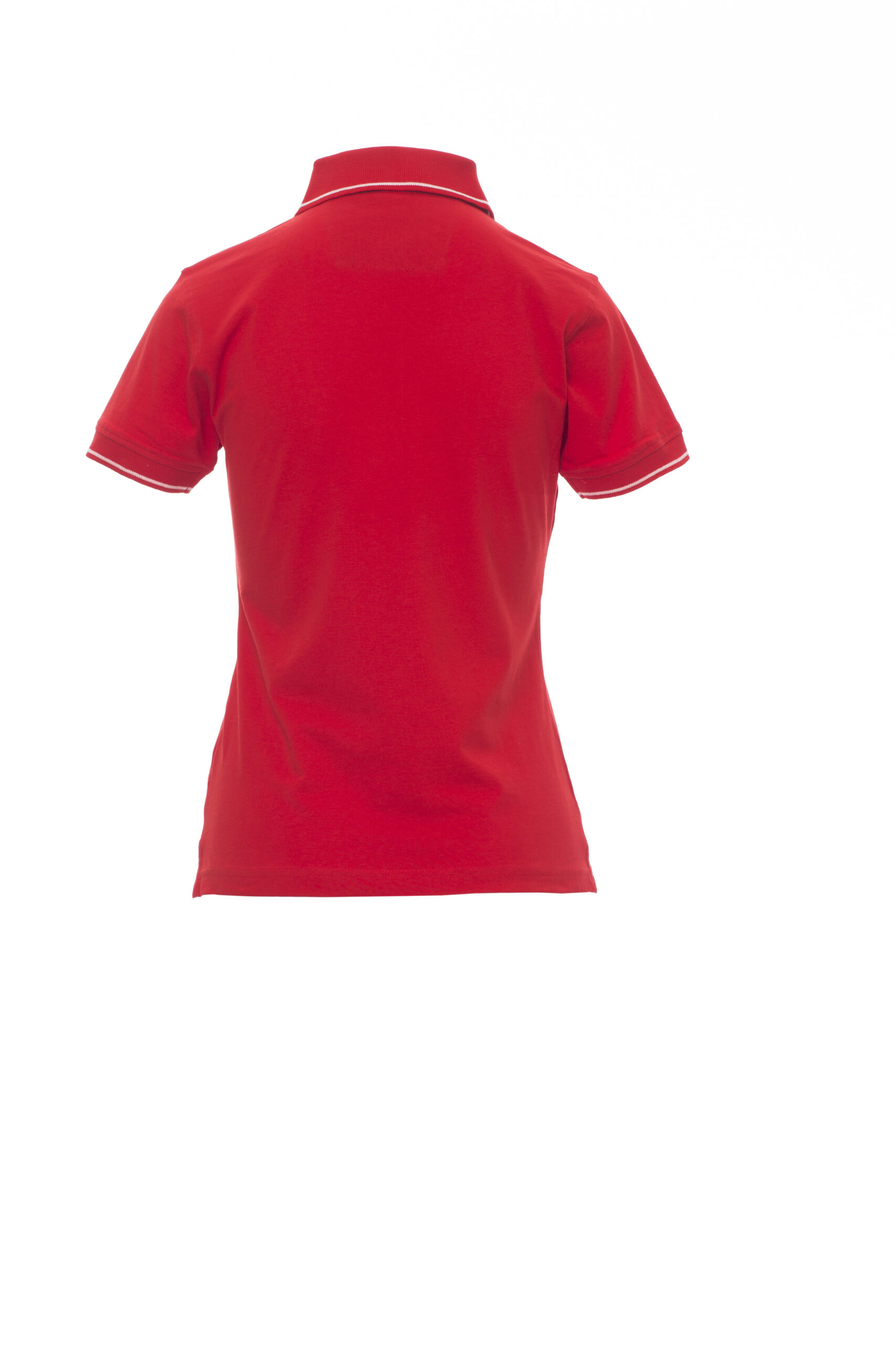 Camiseta polo ceñida de manga corta para mujer, con 6 botones blancos, parte interior del cuello, solapa y ventilaciones laterales en azul Oxford, cuello y extremo de las mangas elásticos con fino ribete de contraste, ojetes en axilas, ventilaciones laterales con costuras reforzadas, cinta de refuerzo lateral, costuras elásticas, cinta en la parte interior del cuello. Composición: 100 % Algodón. Gramaje: 175 GR/MQ