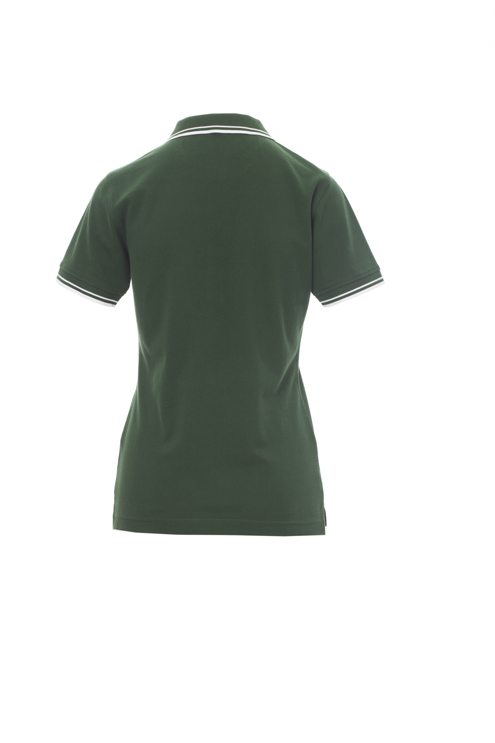 Camiseta polo ceñida de manga corta para mujer, con 5 botones blancos, fino ribete de contraste en cuello y mangas, cuello y extremo de las mangas elásticos, ventilaciones laterales con costuras reforzadas, pespunte oculto en cuello, cinta de refuerzo lateral, costuras elásticas, cinta en la parte interior del cuello. Composición: 100 % Algodón. Gramaje: 210 GR/MQ