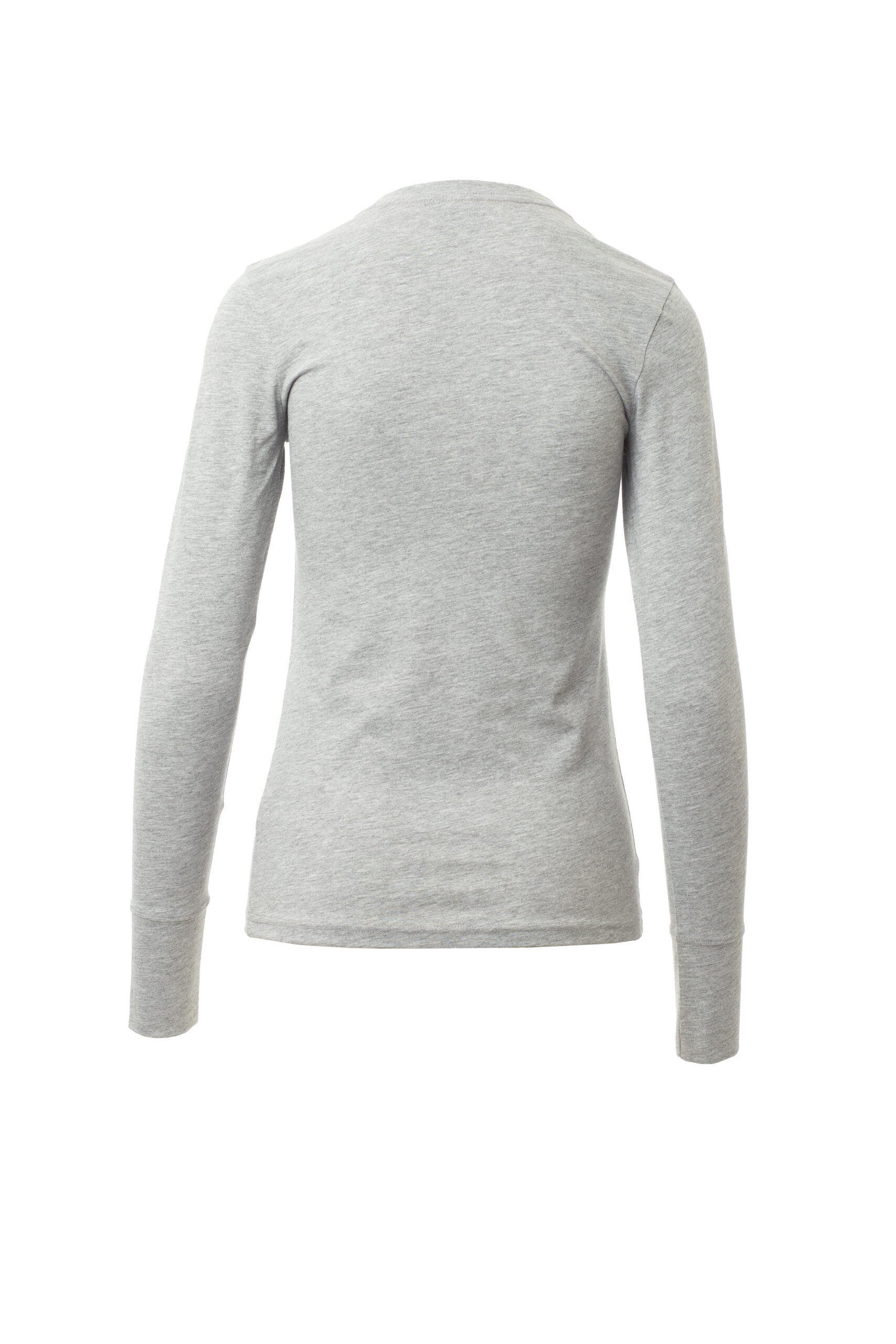 Camiseta ceñida de manga larga y cuello redondo para mujer, con banda elástica en cuello de elastano de 1,5 cm con pespunte superior en la parte delantera, puños largos, cinta de refuerzo de contraste de hombro a hombro visible en la parte interior del cuello, costuras elásticas, costuras laterales. Composición: 100 % Algodón. Gramaje: 165 GR/MQ
