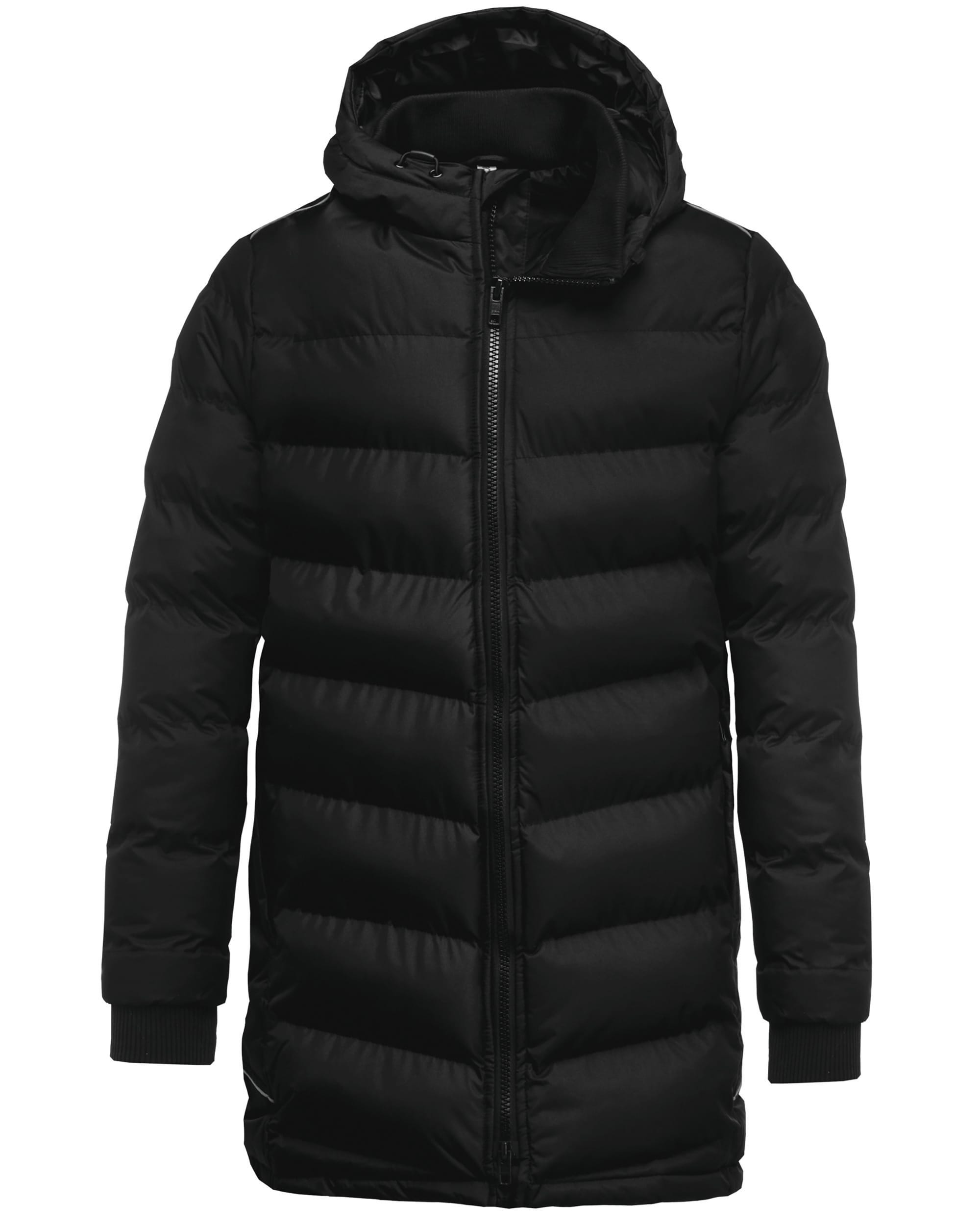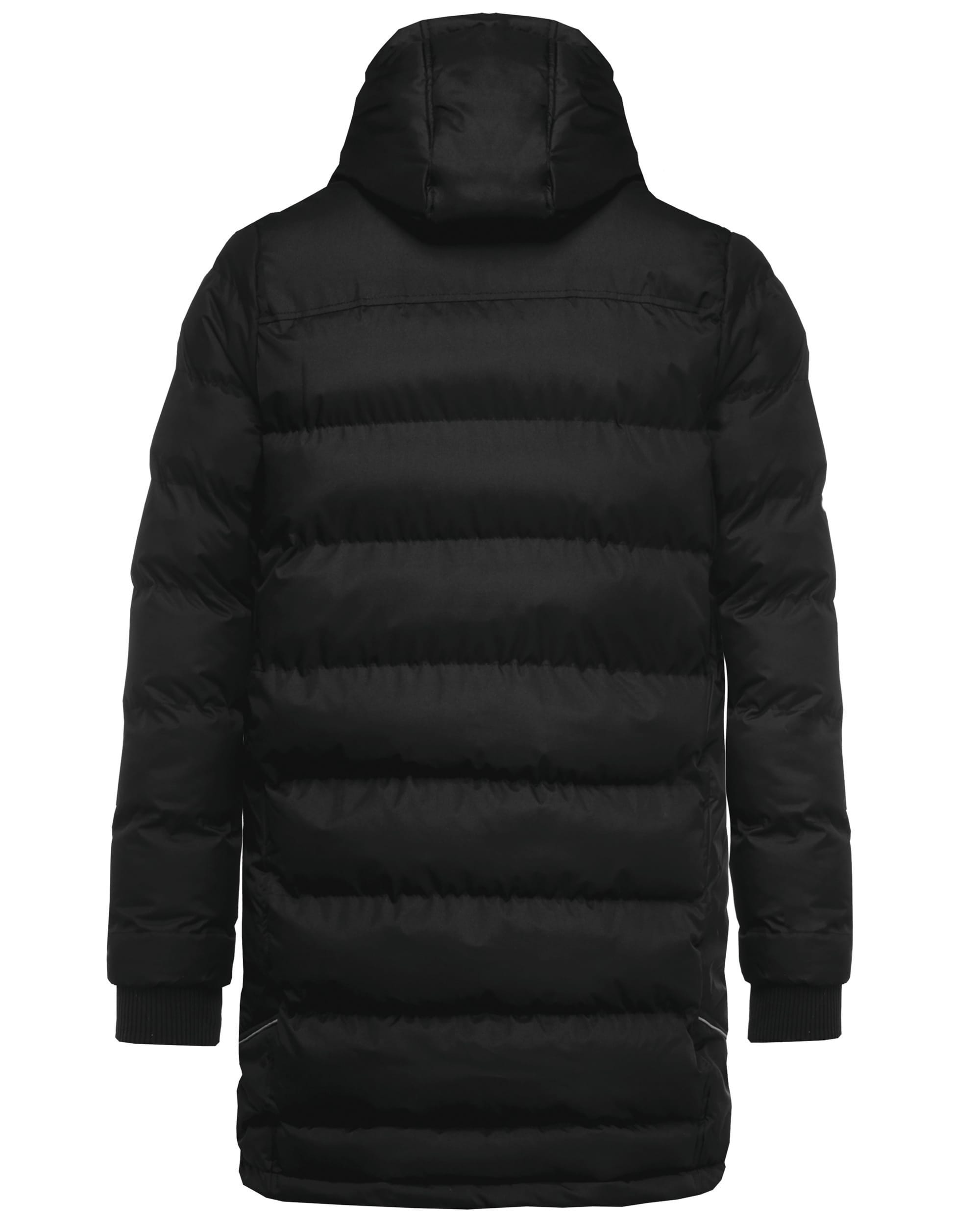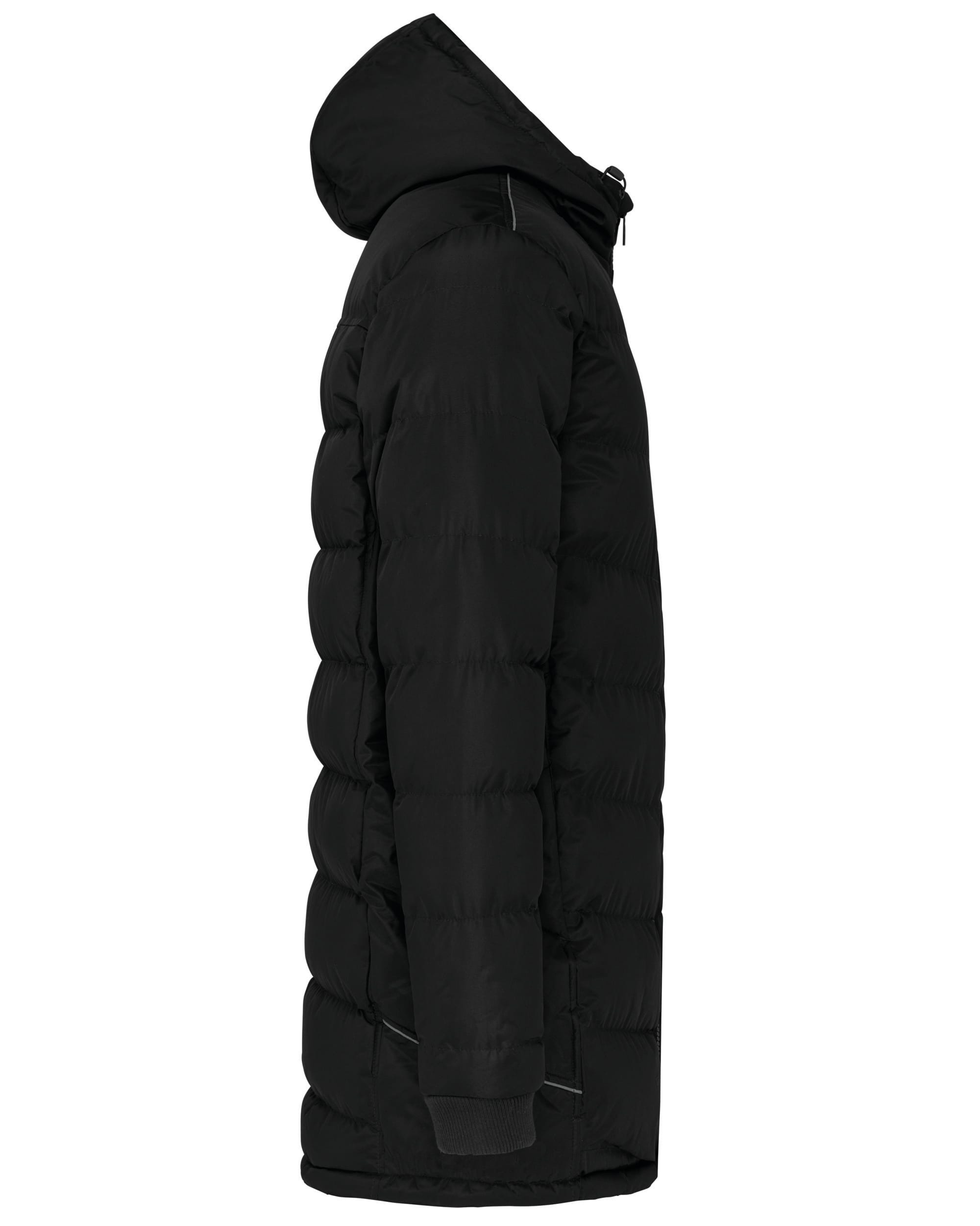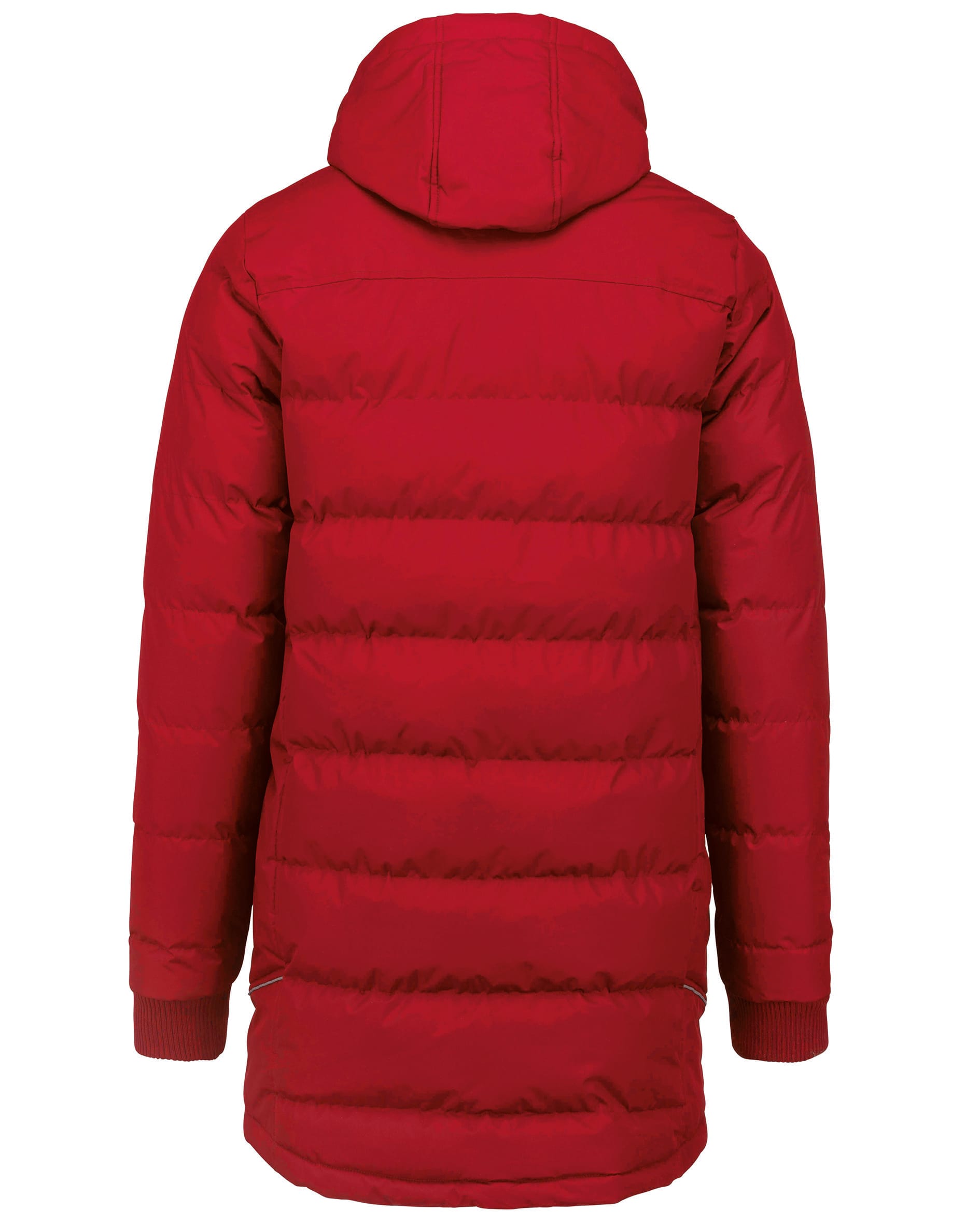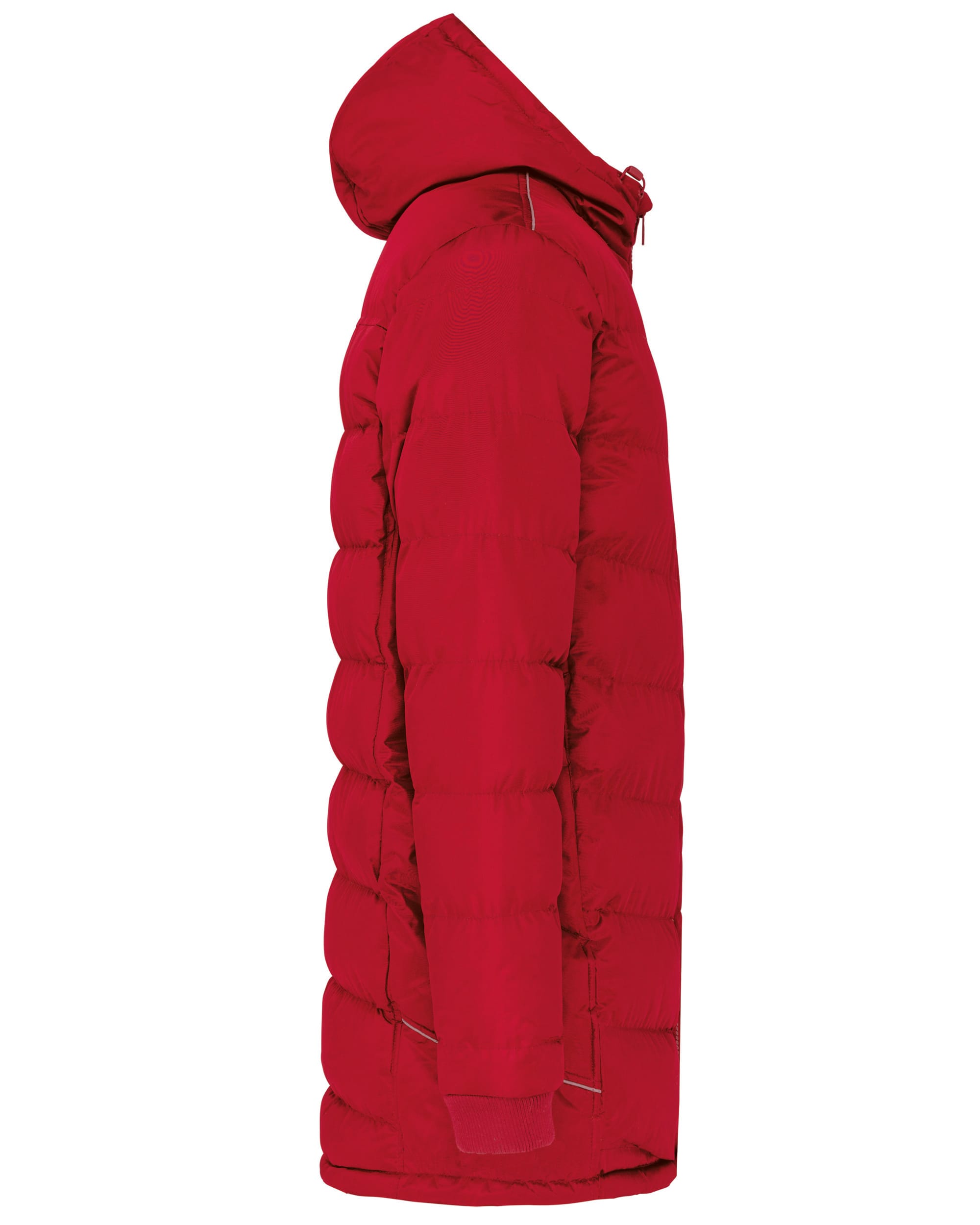 Exterior : 100% poliéster con revestimiento de PVC (tratamiento hidrófugo) 200g/m² . Acolchado interior : 100% poliéster 350g/m². Forro 100% poliéster 60g/m². Dos bolsillos laterales con cremallera. Un bolsillo interior. Cuello y puños de canalé. Bies reflectante en hombros y laterales. Capucha forrada. Una cremallera en el pecho y en la parte inferior de la prenda para la personalización.