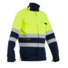 Cazadora multinorma alta visibilidad. Cierre de cremallera con tapa de solapa de velcro. 2 bolsillos en el pecho con solapa de velcro. Rayas reflectantes cosidas de 5 cm alrededor de mangas y cintura. Con tejido flúor. Ajuste de velcro en los puños de las mangas y el cuello para mayor seguridad. Ignífuga, antiestática y protección contra arco eléctrico. Detalles en color amarillo. Base: 99% algodón y 1% fibra antiestática. Gramaje: 260GSM. Flúor: modacrílico multifibra.
