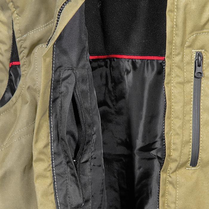 Amplios bolsillos delanteros, capucha ajustable y extraíble, forro interior con espalda de algodón polar, parte trasera más larga, insertos reflectantes, pasador auricolar, aberturas laterales en la cintura, bolsillo interior con cierre de cremallera, bolsillo en el pecho con cierre de cremallera encerada, bolsillo portamóvil con tejido aislante E-WARD, bolsillos forrados por algodón polar, bolsillo trasero, bajo de la prenda con cierre de cremallera. Composición: 100% poliéster encerado poliuretano, ACOLCHADO: 100% poliéster, FORRO: 100% poliéster. Gramaje: 200 g/m².