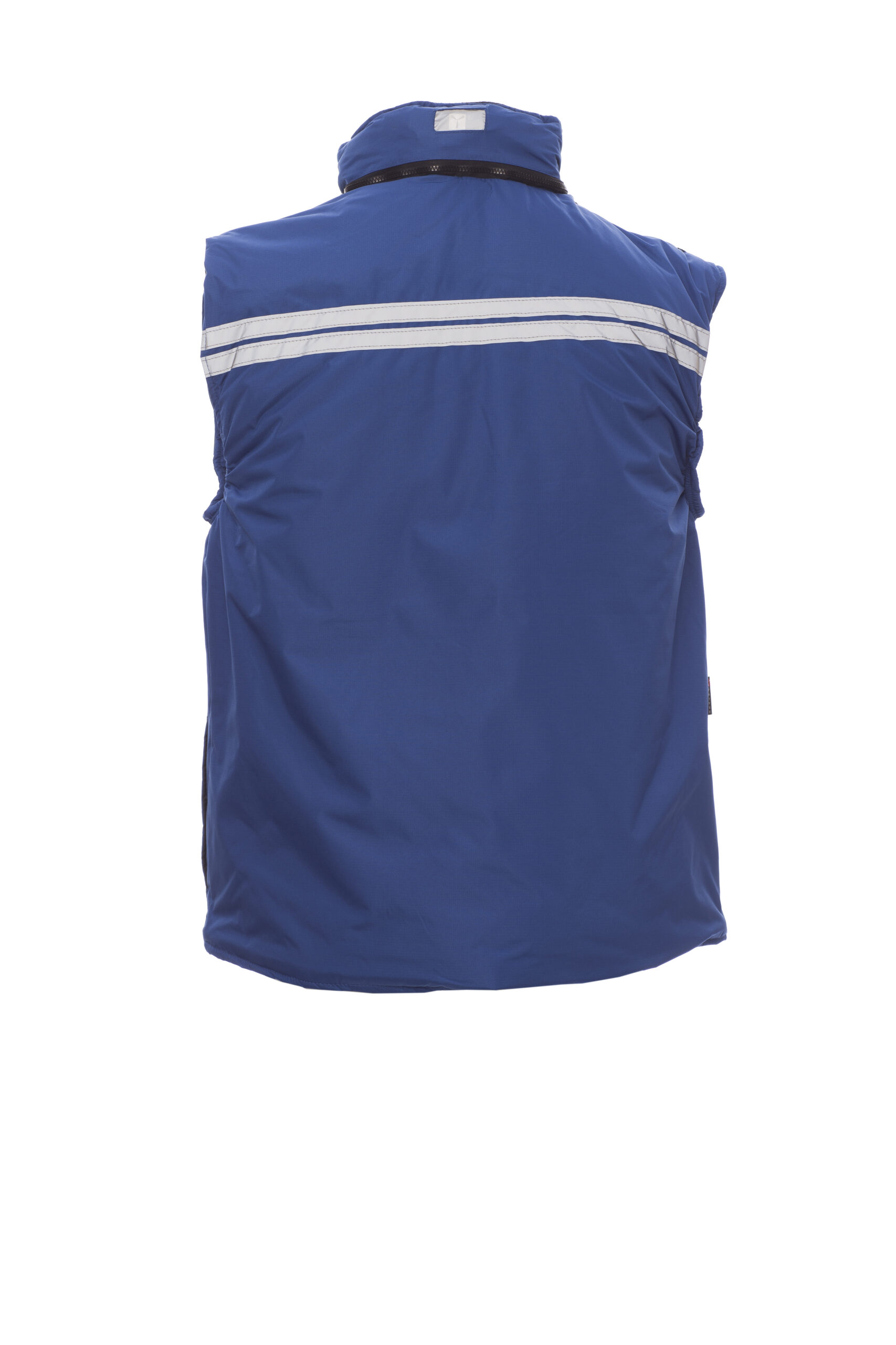 Chaleco para hombre, cremallera de plástico de 8 mm con cursor metálico, con tapeta y botones de plástico, capucha extraíble o plegable en el cuello, bandas reflectantes de Color gris en la parte delantera y trasera, corte lateral con fuelle y cremallera, nueve bolsillos exteriores, dos con LOCK SYSTEM, dos con cremallera y parte interior reforzada, uno con soporte plegable para tarjeta de identificación reversible. Interior: acolchado, calentador de micro forro polar en la parte interior del cuello, espalda y zona lumbar, cordón y cremallera interior para facilitar la impresión y el bordado. Composición: 100 % Poliéster. Gramaje: 200 GR/MQ
