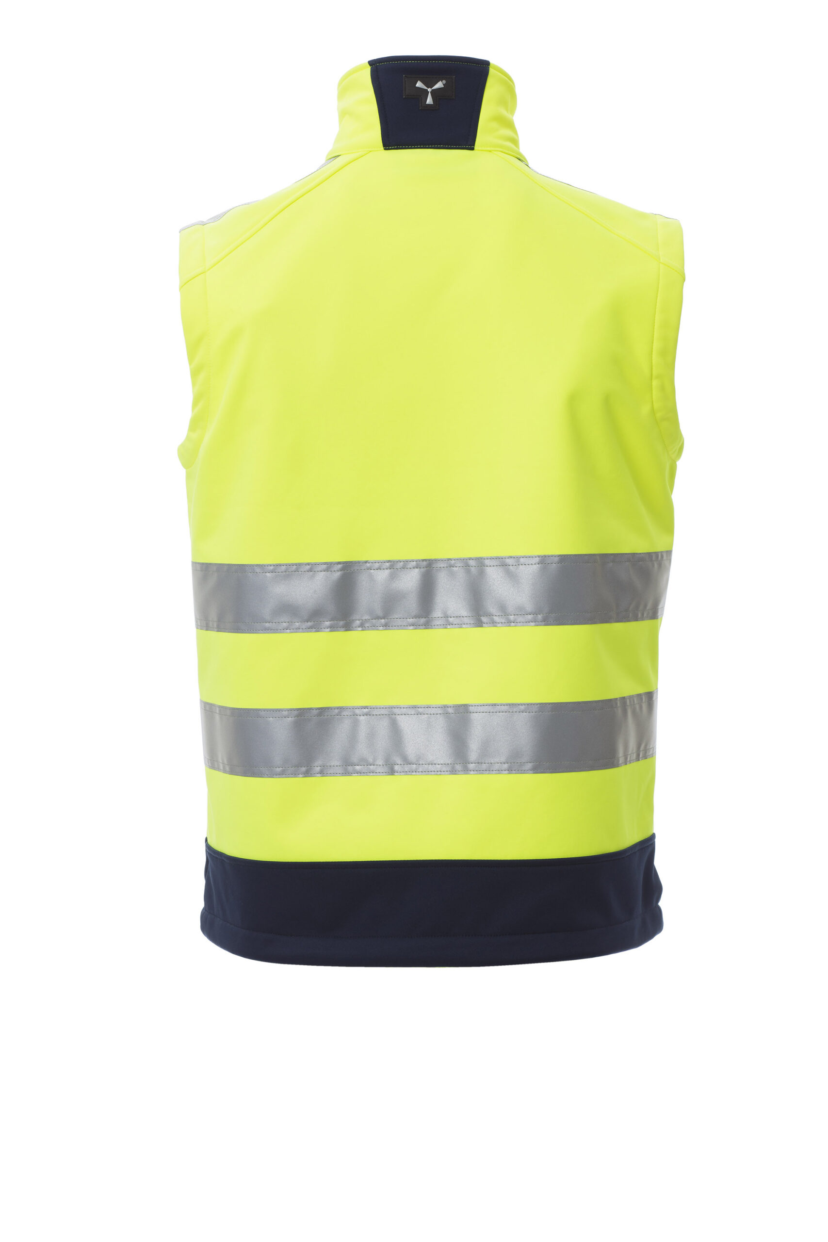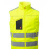 WP 8000 mm H₂O, WVT 5000 g/m² 24h. Chaleco de hombre ergonómico, biColor de alta visibilidad, con bandas de 3M, con cremallera SBS larga con cinta, dos bolsillos laterales con cremallera, un bolsillo en el pecho, soporte para tarjetas extraíble y desmontable.