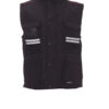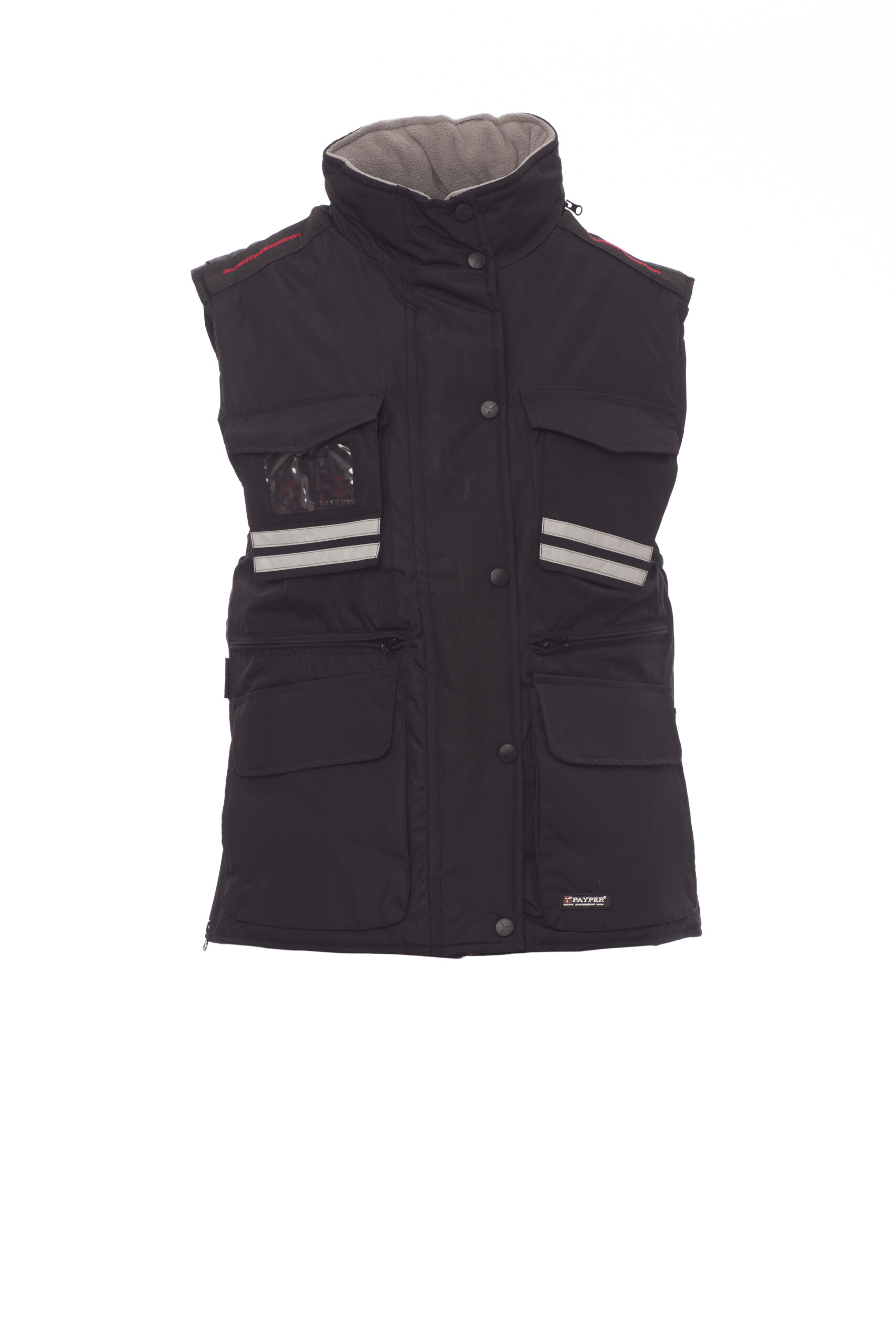 Chaleco ergonómico para mujer, cremallera de plástico de 8 mm con cursor metálico, con tapeta y botones de plástico, capucha extraíble o plegable en el cuello, bandas reflectantes de Color gris en la parte delantera y trasera, corte lateral con fuelle y cremallera, nueve bolsillos exteriores, dos con LOCK SYSTEM, dos con cremallera y parte interior reforzada, uno con soporte plegable para tarjeta de identificación reversible. Interior: acolchado, calentador de micro forro polar en la parte interior del cuello, espalda y zona lumbar, cordón y cremallera interior para facilitar la impresión y el bordado.