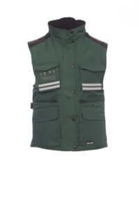 Chaleco ergonómico para mujer, cremallera de plástico de 8 mm con cursor metálico, con tapeta y botones de plástico, capucha extraíble o plegable en el cuello, bandas reflectantes de Color gris en la parte delantera y trasera, corte lateral con fuelle y cremallera, nueve bolsillos exteriores, dos con LOCK SYSTEM, dos con cremallera y parte interior reforzada, uno con soporte plegable para tarjeta de identificación reversible. Interior: acolchado, calentador de micro forro polar en la parte interior del cuello, espalda y zona lumbar, cordón y cremallera interior para facilitar la impresión y el bordado. Composición: 100 % Poliéster. Gramaje: 200 GR/MQ