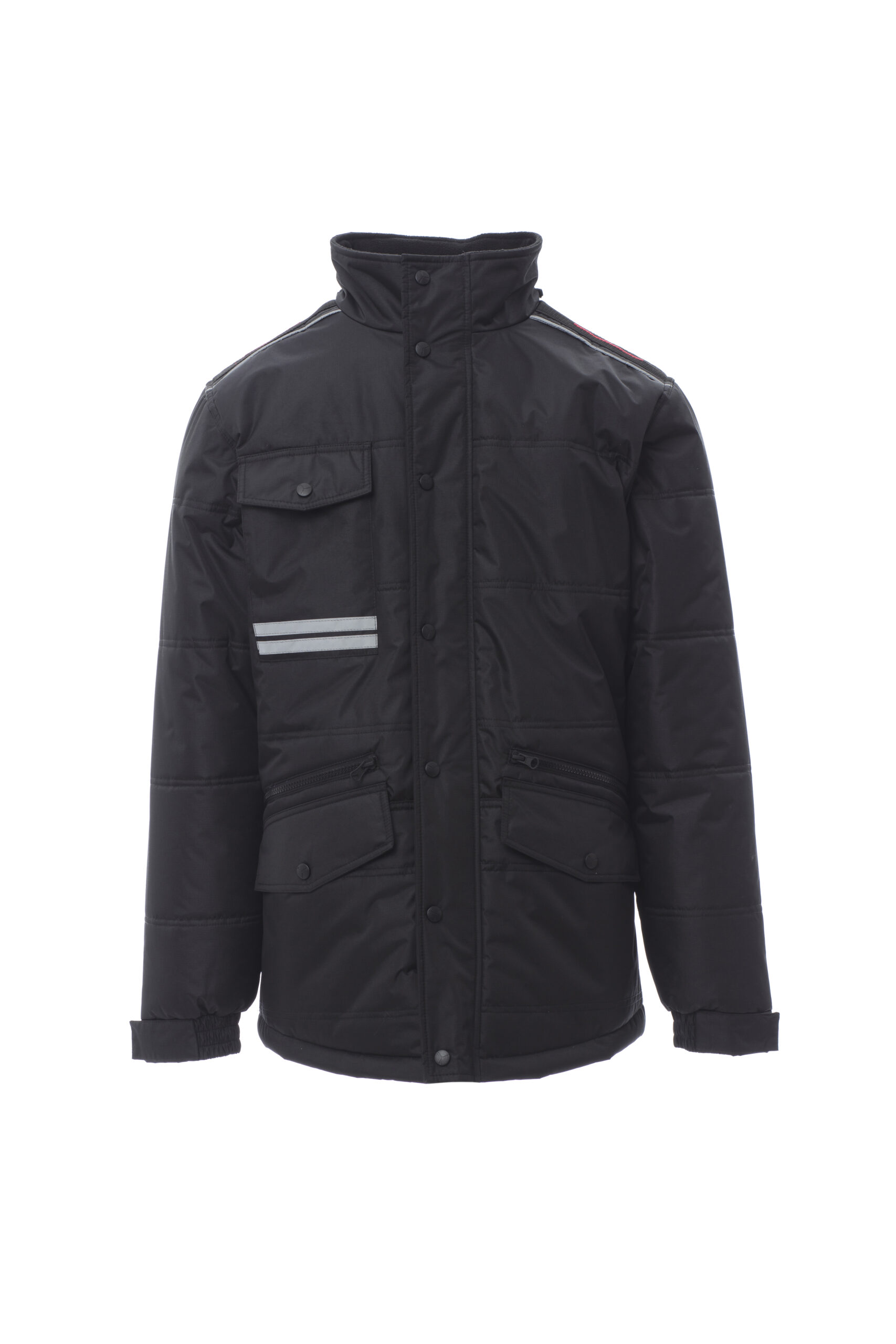 Chaqueta 3/4 para hombre, cremallera de 8 mm de plástico con cursor de metal con tapeta y botones de plástico, parte posterior contorneada y con capucha plegable en el cuello, dos bolsillos exteriores LOCK SYSTEM y dos bolsillos con cremallera, bolsillos sesgados para fácil acceso, un bolsillo a la altura del pecho para teléfono móvil y anilla de soporte para tarjeta de identificación, bandas reflectantes en el bolsillo y en la parte trasera. Interior: acolchado, forro polar de contraste en espalda y cuello, un bolsillo, cremallera interior para facilitar la impresión y el bordado.