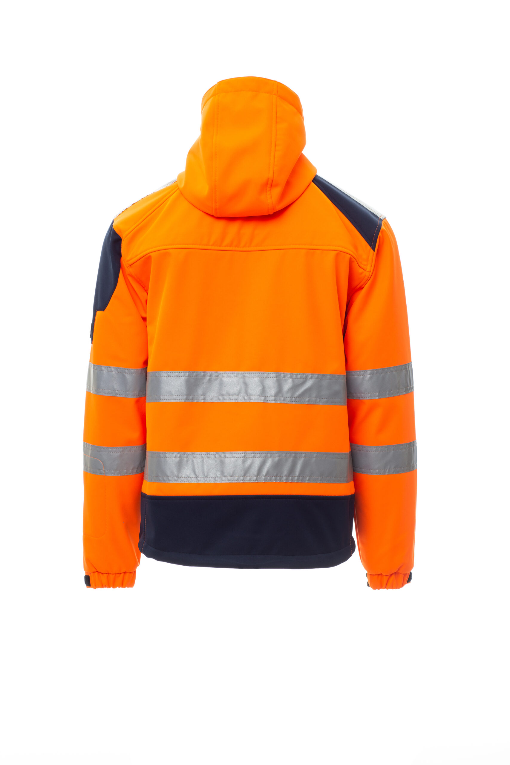 WP 8000 mm H₂O, WVT 5000 g/m² 24h. Chaqueta de hombre ergonómica, bicolor, de alta visibilidad, con bandas de 3M, manga ranglán, capucha contorneada con dos costuras y con cordón, cremallera SBS larga, puños ajustables con velcro, dos bolsillos laterales con cremallera, un bolsillo en el pecho, soporte para tarjetas extraíble y plegable y un bolsillo en el brazo izquierdo. Composición: 100 % Poliéster. Gramaje: 310 GR/MQ