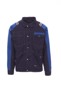 Chaqueta no acolchada con aplicaciones y pespuntes biColor en contraste; corte estilizado tipo vaquero, cierre delantero con cremallera y tapeta de cobertura con botones, puños y cintura ajustables con botón; dos bolsillos delanteros modelo canguro con tapeta LOCK SYSTEM y botón metálico, dos bolsillos a la altura del pecho, uno de los cuales con LOCK SYSTEM, soporte para tarjeta de identificación extraíble y plegable, soporte para teléfono móvil; ribete reflectante en la espalda; bandas reflectantes en los hombros para más seguridad y visibilidad. Interior sin forrar. Composición: 100 % Algodón. Gramaje: 250 GR/MQ