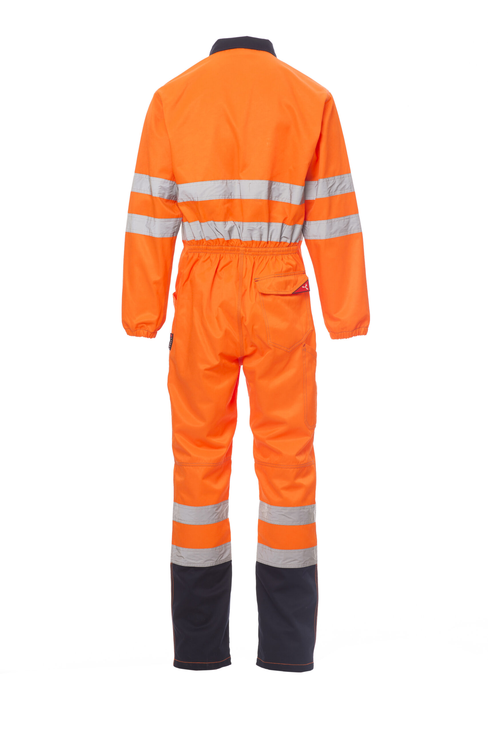 Mono de alta visibilidad con bandas reflectantes, cremallera central cubierta de doble cursor, elástico en la cintura en la parte posterior. Triple costura de refuerzo en la entrepierna y en la parte interior de la pierna. Dos amplios bolsillos a la altura del pecho, uno con tapeta y gancho para identificación personal, un soporte para bolígrafos, un bolsillo trasero con tapeta, soporte para metro lateral derecho. Puños con elásticos. Composición: 50 % Algodón + 50 % Poliéster. Gramaje: 250 GR/MQ