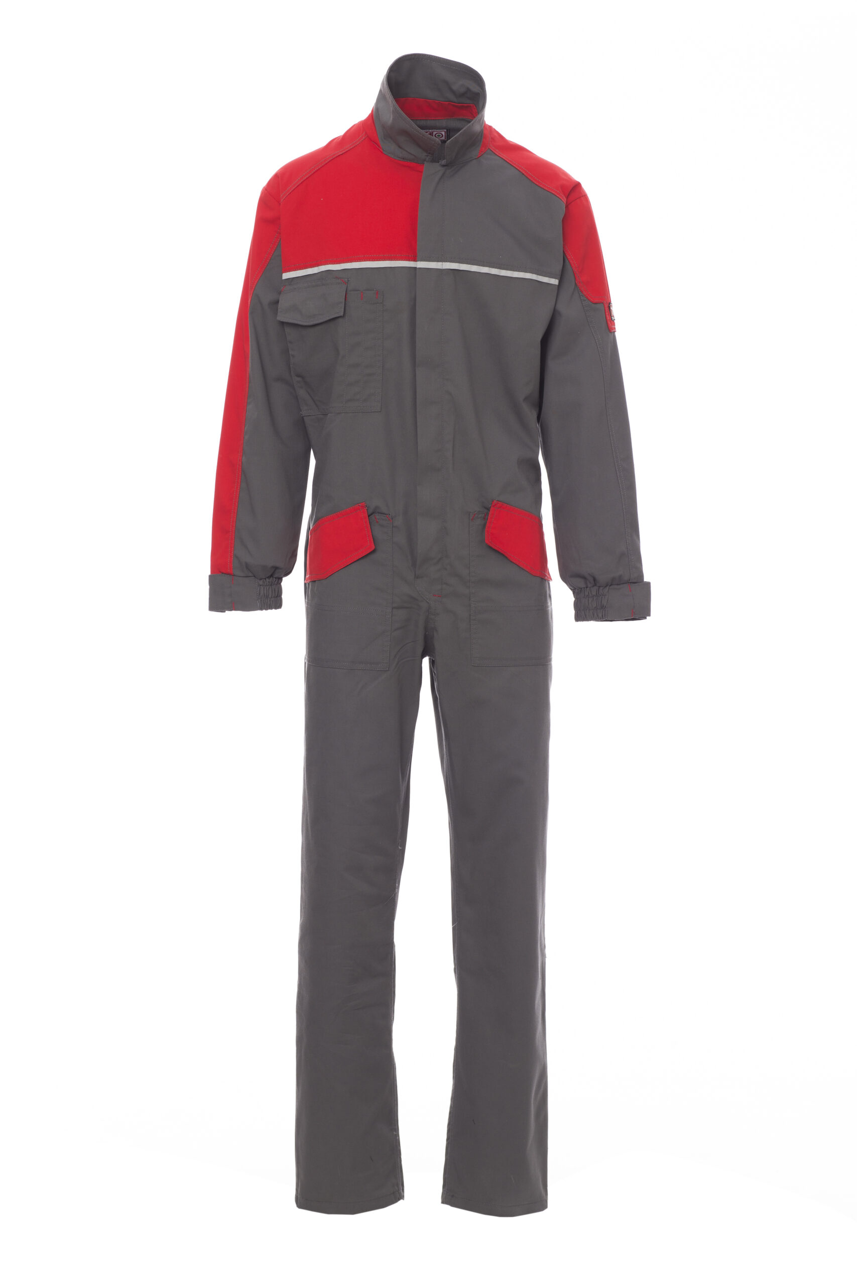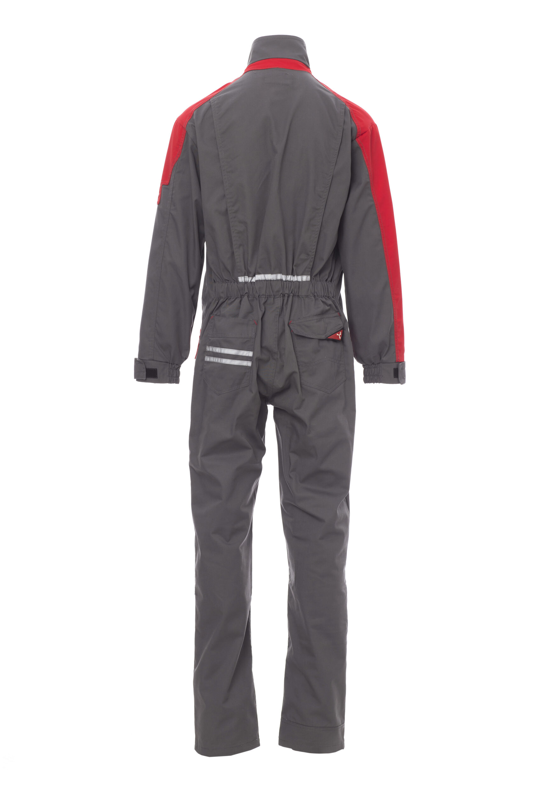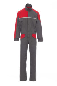Mono de trabajo en dos tonalidades, cierre delantero con cremallera, puños elásticos y botón de cierre en puño, dos bolsillos LOCK SYSTEM reforzados en la parte inferior, un amplio bolsillo multifunción a la altura del pecho, bolsillo para smartphone y soporte para insignia de identificación plegable, dos bolsillos traseros, uno con solapa y otro con dos bandas reflectantes, banda reflectante en pecho y espalda, espalda elástica y con pliegue para facilitar el movimiento. Composición: 65 % Poliéster + 35 % Algodón. Gramaje: 250 GR/MQ