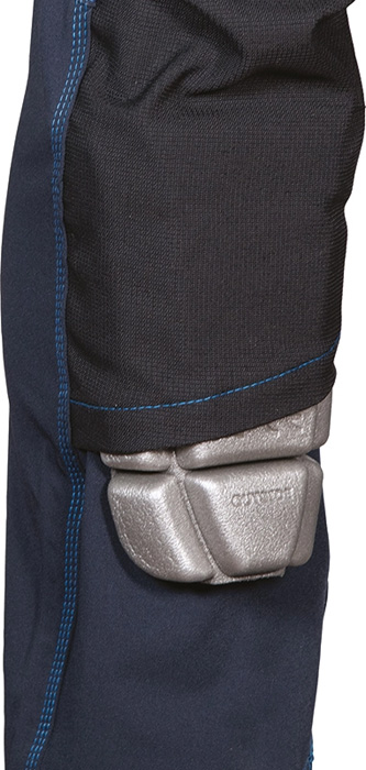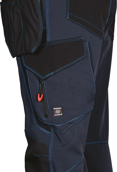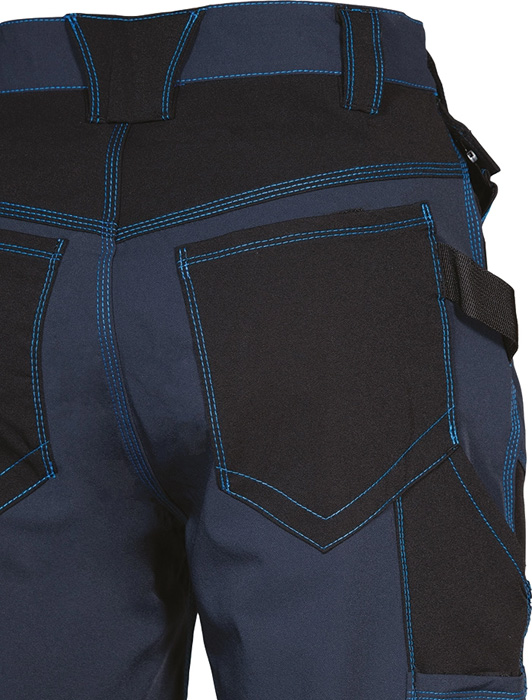 2 amplios bolsillos delanteros, doble bolsillo trasero cerrado con velcro, insertos reflectantes, pasador portamartillo, corte ergonómico de las piernas y rodillas, bolsillo lateral con doble abertura (cierre con velcro y cremallera), bolsillo porta metro, bolsillos exteriores porta clavos de nylon, desmontables por cremallera, bolsillo para rodilleras en nylon con posición ajustable, tejido elástico. Composición:94% nylon – 6% elastán + insertos resistentes a la abrasión en 100% nylon. Gramaje: 250 g/m².