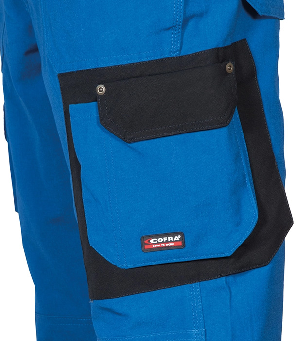 Doble bolsillo trasero, uno con tapeta, rodillas reforzadas, inserto portabolígrafos, pasador portamartillo, corte ergonómico de las piernas y rodillas, bolsillo lateral izquierdo con tapeta, bolsillo porta metro, bolsillo delanteros, cintura ajustable. Composición: 100% algodón canvas. Gramaje: 250 g/m².