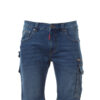 Pantalón pirata (3/4), unisex, tejido «4 way stretch», con elásticos laterales y trabillas en la cintura, cierre con cremallera y botón personalizado. En el delantero tiene dos bolsillos redondeados, un bolsillo pequeño para monedas a la derecha y un bolsillo pequeño de seguridad cerrado con cremallera a la izquierda. En la parte delantera de la pernera izquierda presenta 3 bolsillos: un bolsillo horizontal cerrado con una cremallera, un bolsillo con tapeta perfilada cerrado con velcro y con soporte para tarjeta de identificación y un bolsillo pequeño vertical cerrado con cremallera. Banda retrorreflectante en la parte delantera de la pernera derecha. Ambas perneras disponen de bolsillos para rodilleras con apertura por la parte superior. En la parte trasera presenta un bolsillo con tapeta cerrado con velcro y un bolsillo sin tapeta pero con 2 bandas retrorreflectantes, una anilla para el martillo (pernera derecha), un bolsillo abierto para el metro (pernera derecha) y un bolsillo para el teléfono móvil con tapeta y velcro (pernera derecha), aplicaciones retrorreflectantes a la altura de la rodilla (ambas perneras). También presenta pespuntes laterales y costuras de refuerzo en contraste en distintos puntos. En las tallas (italianas) centrales 48-50-52, el interior de la pernera tiene una longitud de 51 cm.