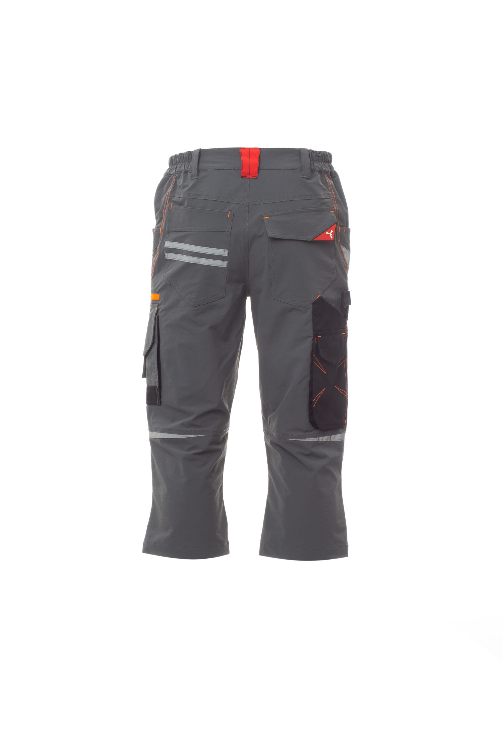 Pantalón pirata (3/4), unisex, tejido «4 way stretch», con elásticos laterales y trabillas en la cintura, cierre con cremallera y botón personalizado. En el delantero tiene dos bolsillos redondeados, un bolsillo pequeño para monedas a la derecha y un bolsillo pequeño de seguridad cerrado con cremallera a la izquierda. En la parte delantera de la pernera izquierda presenta 3 bolsillos: un bolsillo horizontal cerrado con una cremallera, un bolsillo con tapeta perfilada cerrado con velcro y con soporte para tarjeta de identificación y un bolsillo pequeño vertical cerrado con cremallera. Banda retrorreflectante en la parte delantera de la pernera derecha. Ambas perneras disponen de bolsillos para rodilleras con apertura por la parte superior. En la parte trasera presenta un bolsillo con tapeta cerrado con velcro y un bolsillo sin tapeta pero con 2 bandas retrorreflectantes, una anilla para el martillo (pernera derecha), un bolsillo abierto para el metro (pernera derecha) y un bolsillo para el teléfono móvil con tapeta y velcro (pernera derecha), aplicaciones retrorreflectantes a la altura de la rodilla (ambas perneras). También presenta pespuntes laterales y costuras de refuerzo en contraste en distintos puntos. En las tallas (italianas) centrales 48-50-52, el interior de la pernera tiene una longitud de 51 cm. Composición: 90% Nailon + 10% Elastano. Gramaje: 170 GR/MQ