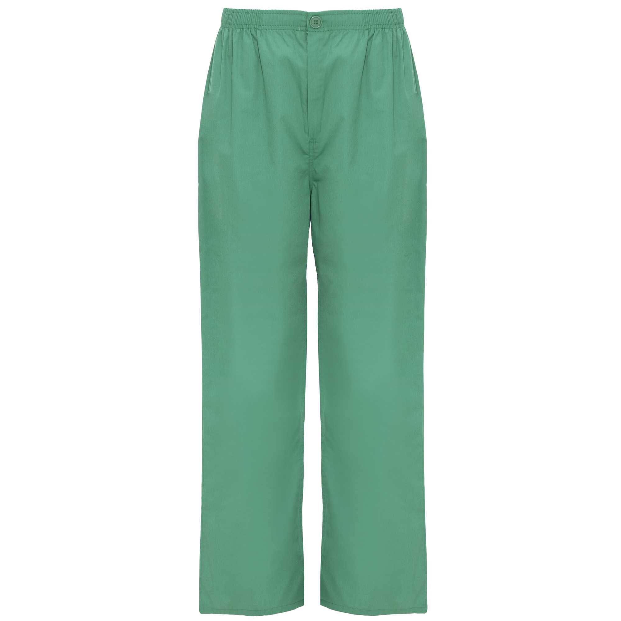 Pantalón sanitario con cintura engomada. Cierre con botón y cremallera al tono. Bolsillo plaqué en el lado derecho. Etiquetado Roly WRK exterior. Composición: 65% poliéster / 35% algodón sarga. Gramaje: 160 g/m².