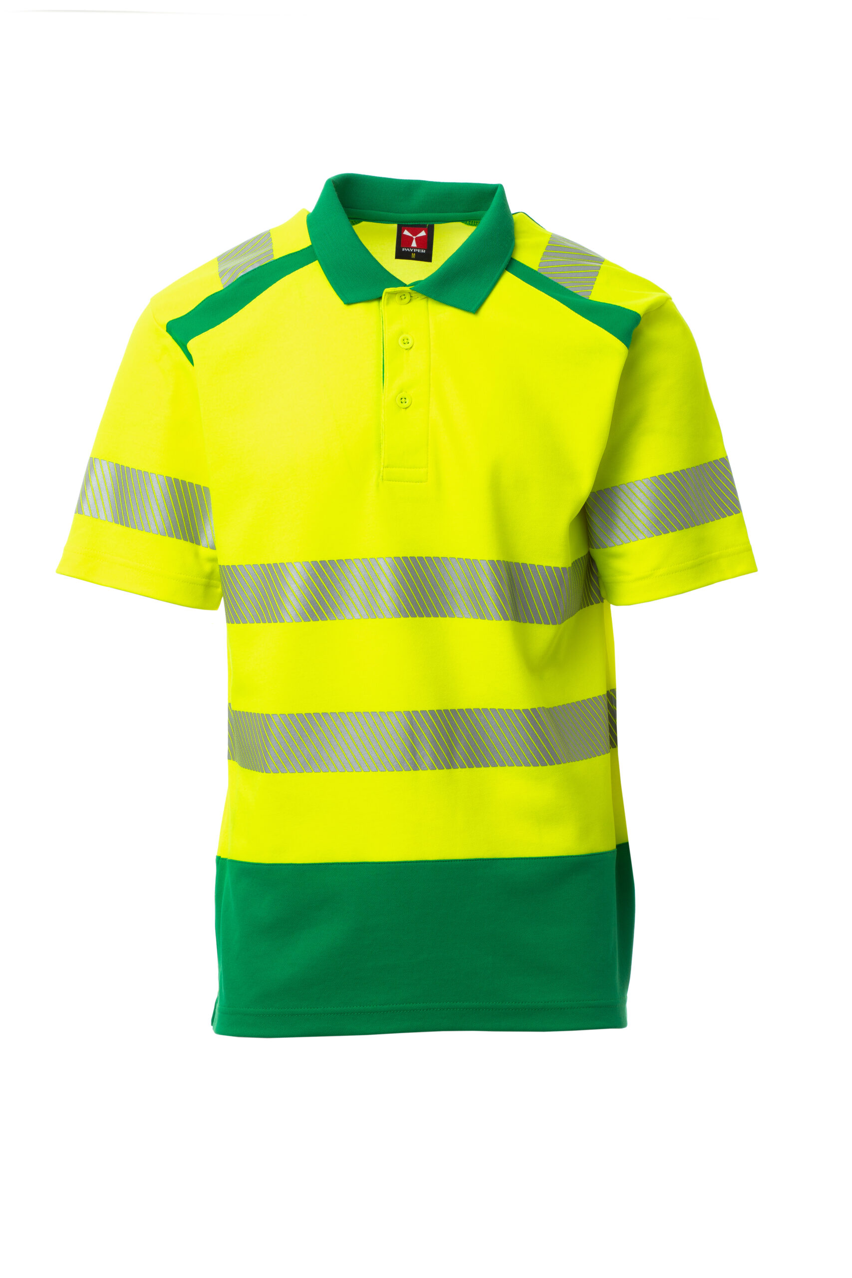 Polo bicolor de alta visibilidad, de manga corta. Cuello con 3 botones, con canalé y costuras cubiertas. Aberturas laterales. Bandas retrorreflectantes segmentadas y termoselladas para facilitar el movimiento. El tejido, confeccionado con algodón en el interior y poliéster en el exterior, garantiza una gran transpirabilidad y comodidad, así como una mayor durabilidad. Composición: 55 % Algodón + 45% Poliéster. Gramaje: 160 GR/MQ