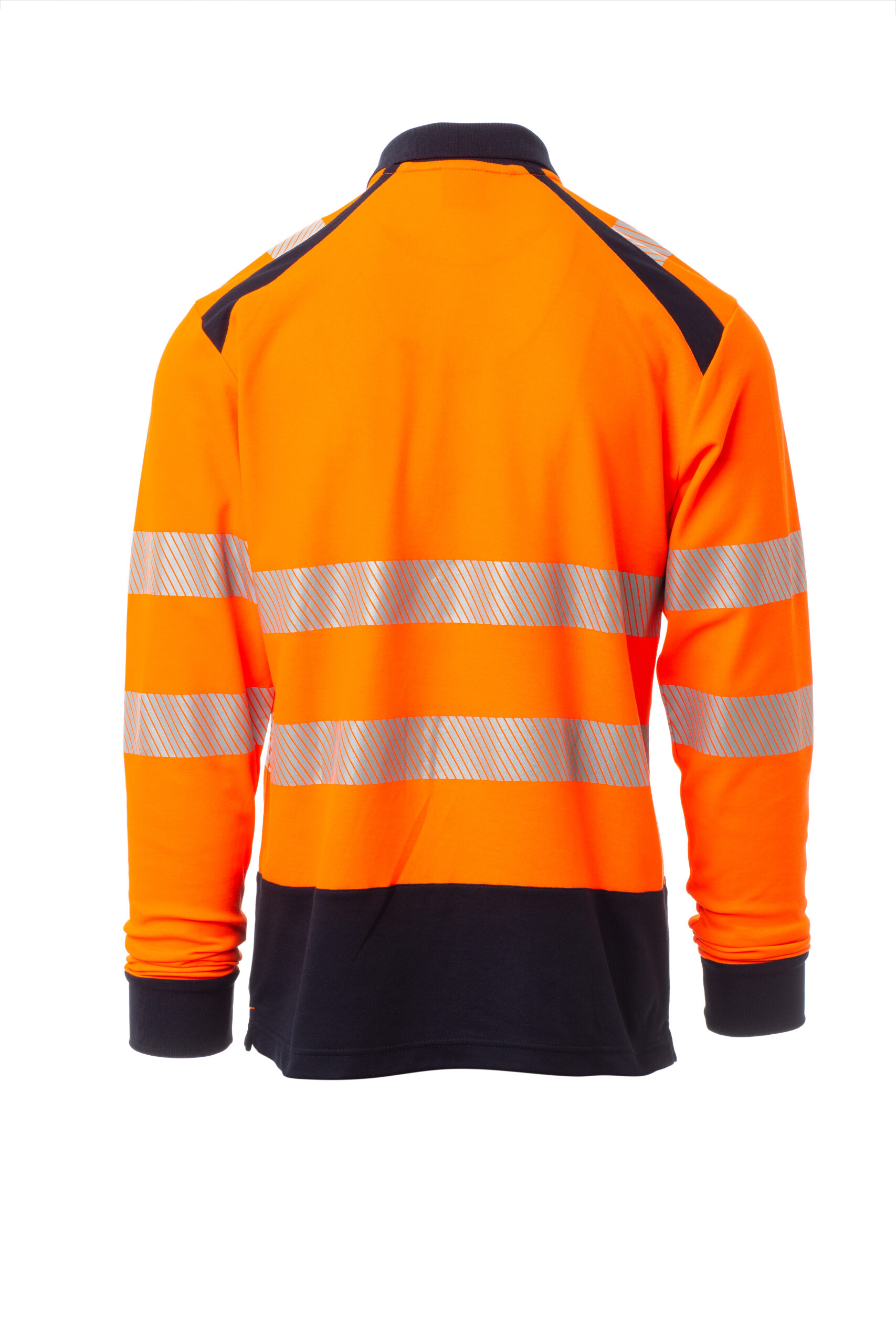 Polo bicolor de alta visibilidad, de manga larga. Cuello con 3 botones, con canalé y costuras cubiertas. Aberturas laterales. Bandas retrorreflectantes segmentadas y termoselladas para facilitar el movimiento. El tejido, confeccionado con algodón en el interior y poliéster en el exterior, garantiza una gran transpirabilidad y comodidad, así como una mayor durabilidad. Composición: 55 % Algodón + 45% Poliéster. Gramaje: 160 GR/MQ