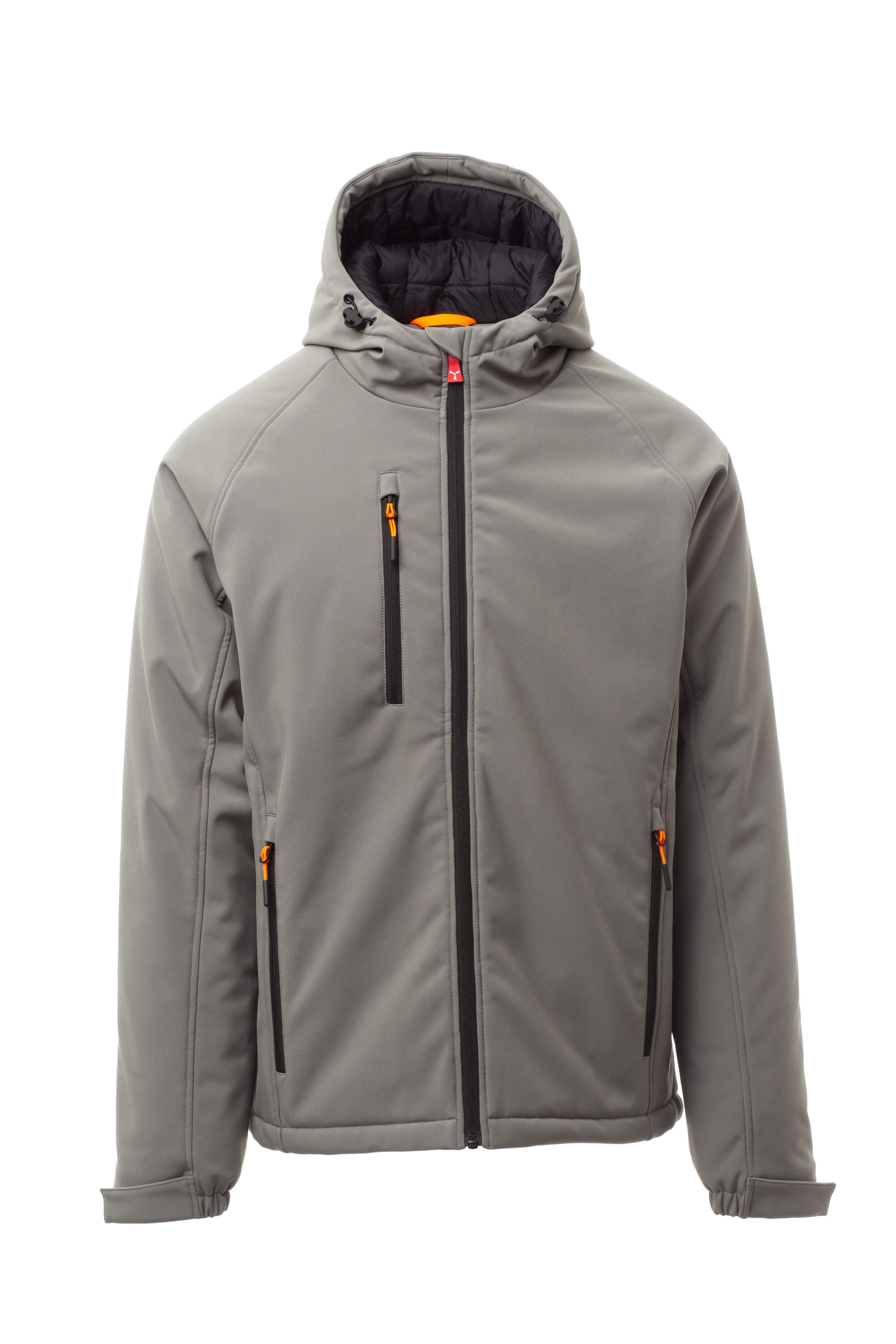 WP 8000 mm H₂O, WVT 5000 g/m² 24h. Soft-shell acolchado de hombre, cierre de cremallera con cursor de metal con sistema de bloqueo semiautomático y tirador personalizado. Capucha fija ajustable con cordón. Puños elásticos, ajustables con velcro. Dos bolsillos laterales y un bolsillo en el pecho, cerrados con cremallera. Tiradores fluorescentes. Dos bolsillos interiores, uno contorneado con cremallera y otro para tableta cerrado con velcro. Bajo ajustable con topes personalizados. Composición: 95 % Poliéster + 5% Elastano. Gramaje: 320 GR/MQ