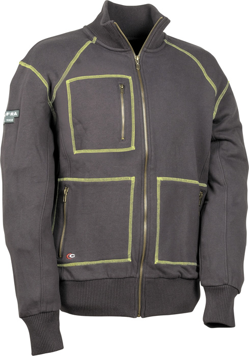 1 bolsillo en el pecho, 2 bolsillos bajo de la prenda con cierre de cremallera YKK®, abertura central con cremallera YKK®, cuello, bajo de la prenda y mangas elásticas. Composición: 100% algodón. Gramaje: 380 g/m².
