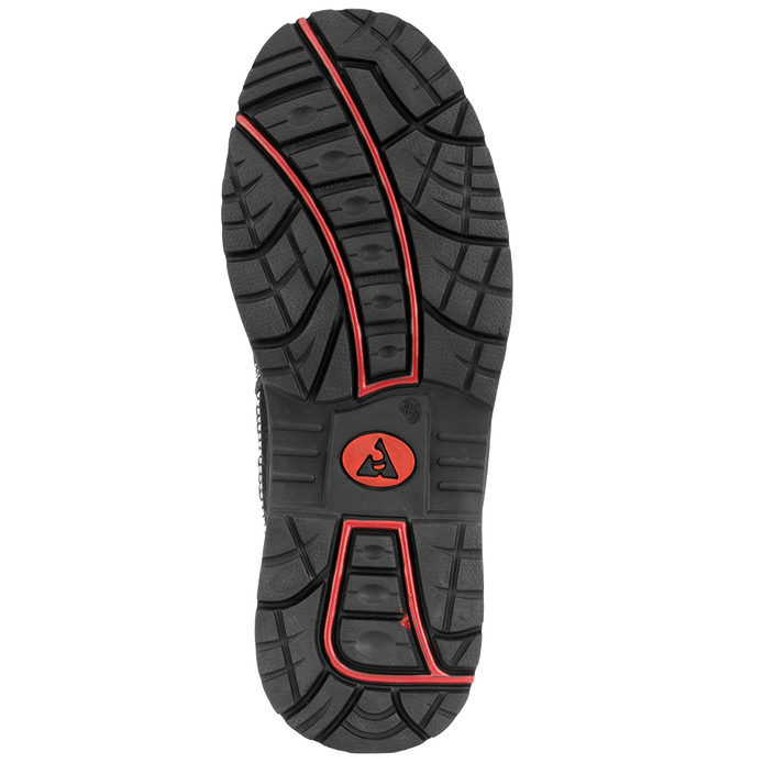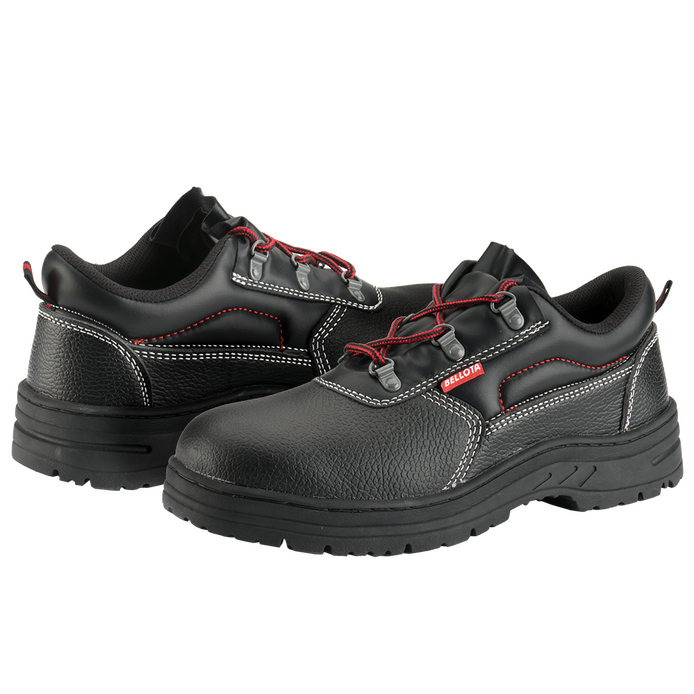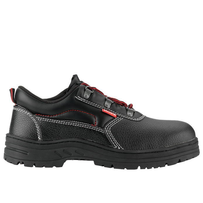 Zapato de seguridad Classic S3 con plantilla antiperforación, puntera de protección metálicas y suela de nitrilo 100% cosida para las condiciones más extremas de calor y humedad. Corte compuesto de piel hidrófuga negra con detalles rojos. Cómodo, robusto y para todas las climatologías..