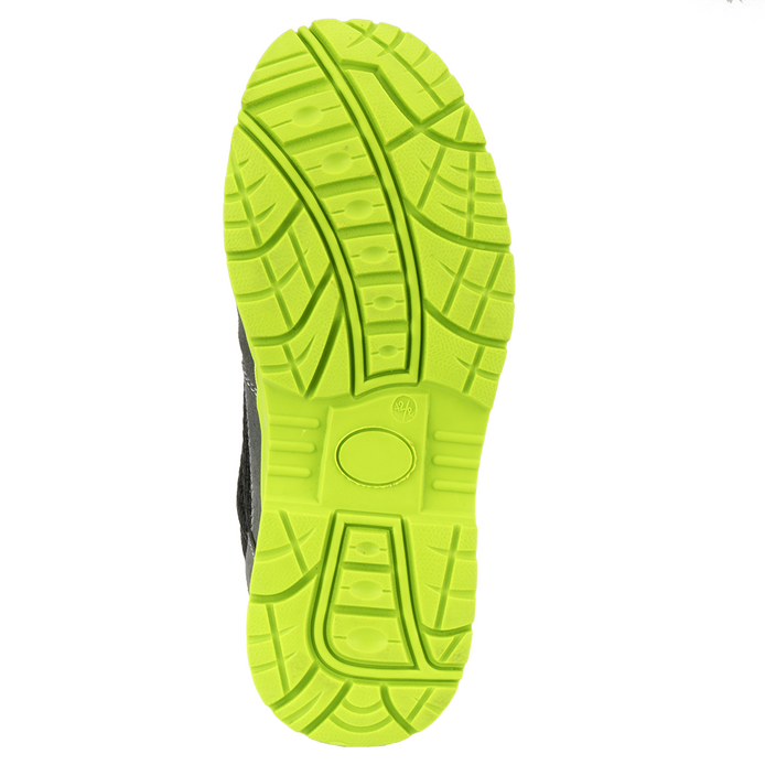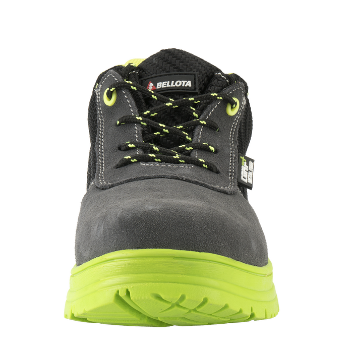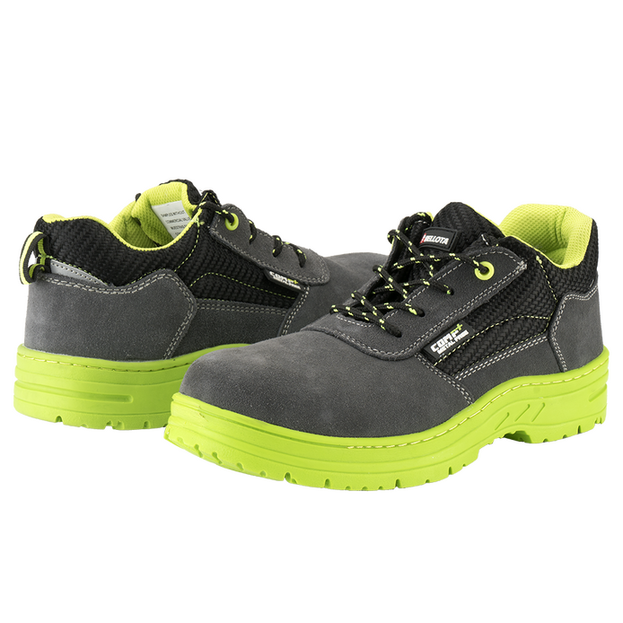 Zapato de seguridad Comp+ S1P Nitrilo, con plantilla antiperforación textil y puntera de fibra de vidrio, en serraje gris transpirable con suela de nitrilo 100% cosida para soportar las condiciones más extremas de calor y humedad. Suela y detalles en verde y elementos reflectantes en el talón. De horma ancha, resulta cómodo, ligero y flexible. Para almacenaje, transporte, industria y construcción