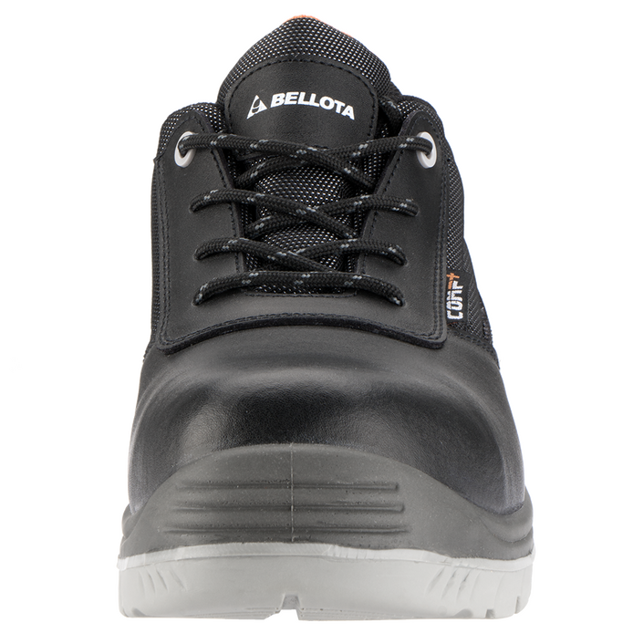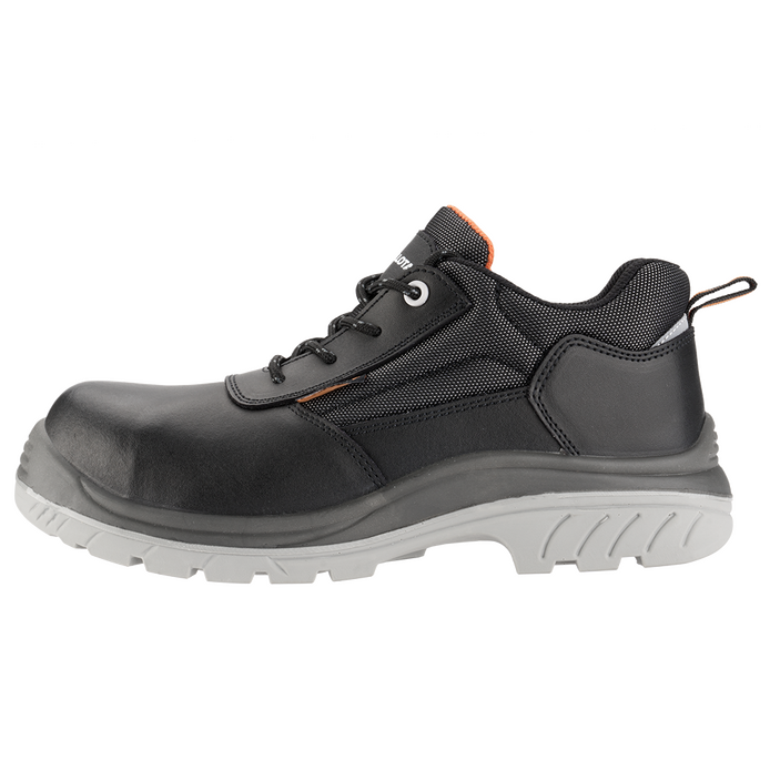 Zapato de seguridad Comp+ S3, con plantilla antiperforación textil y puntera de fibra de vidrio, en piel hidrofugada negra resistente a la penetración y absorción del agua, con suela y detalles en dos tonos de gris y elementos reflectantes en el talón de color naranja. De horma ancha, resulta cómodo, ligero y flexible. Para almacenaje, transporte, industria y construcción.